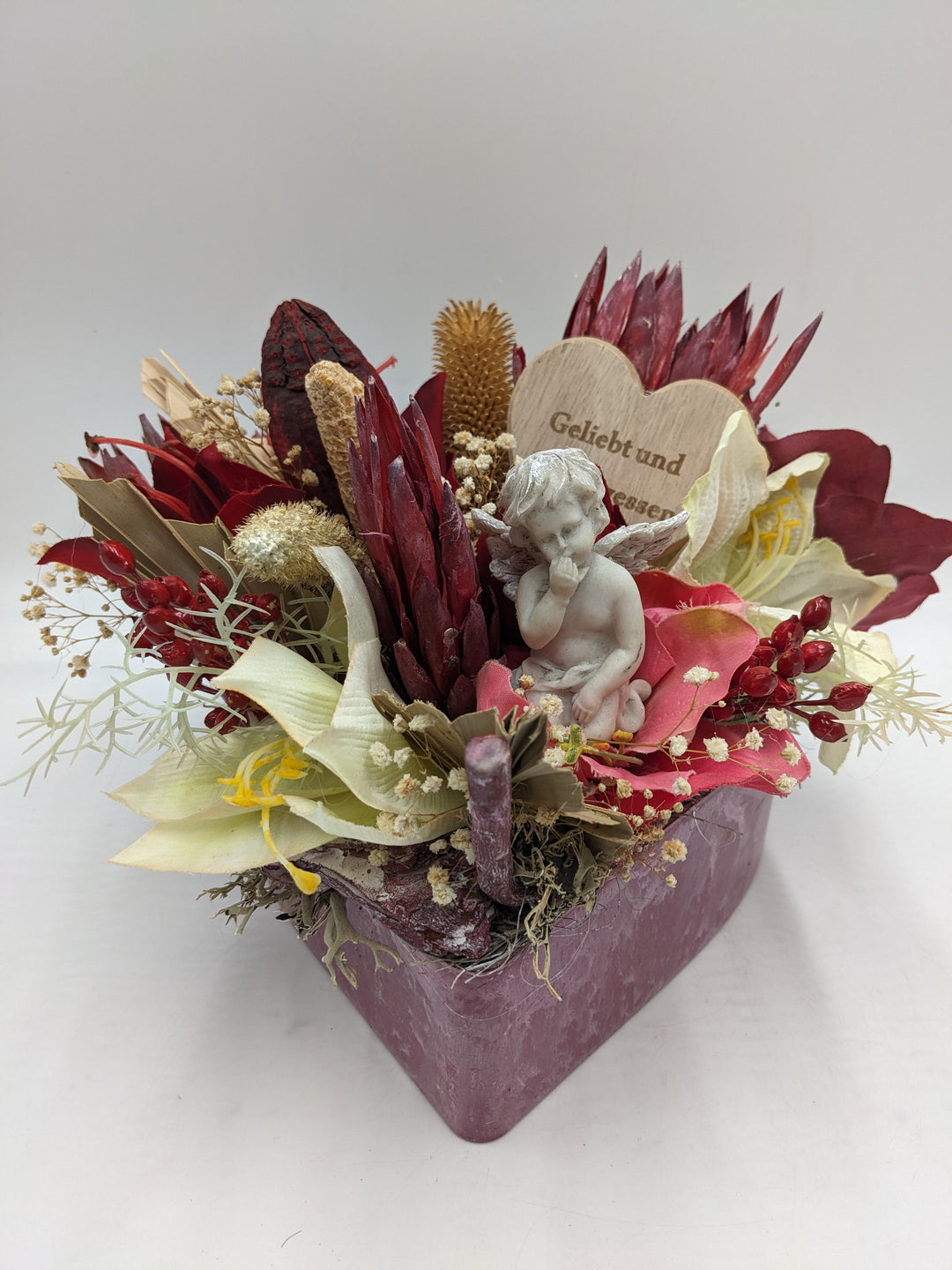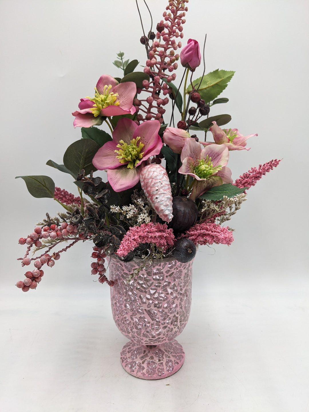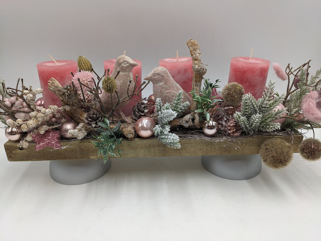 Adventsgesteck Kugel Vogel Zapfen rosa