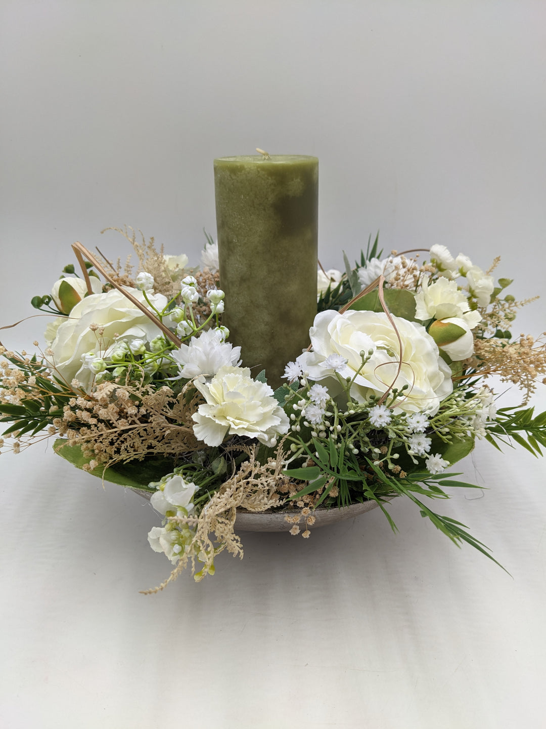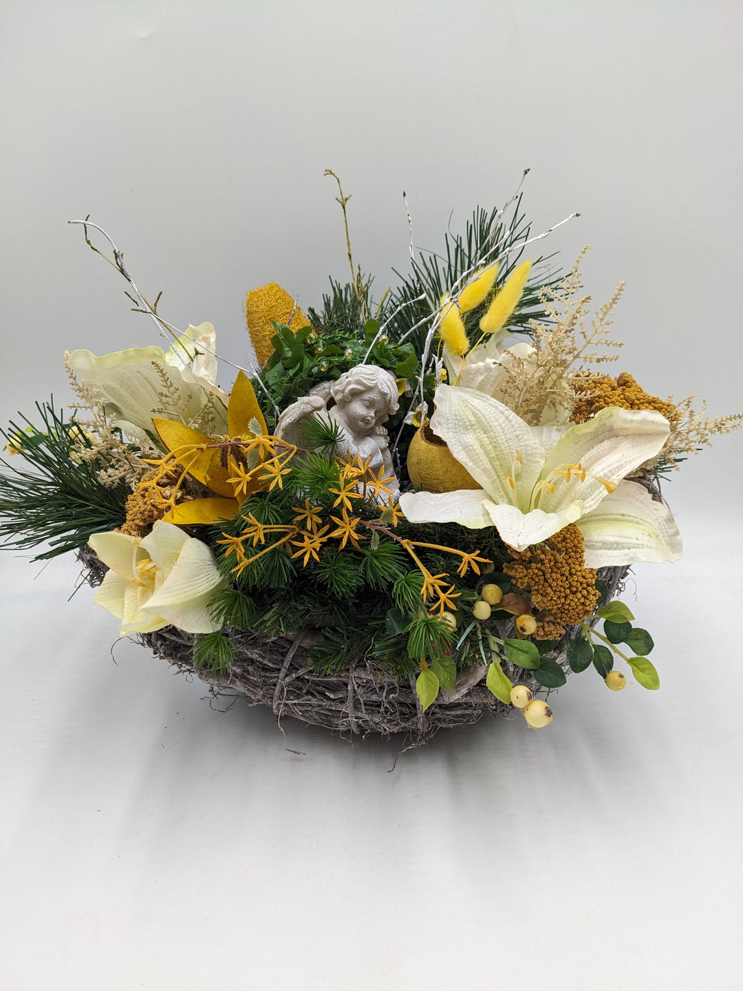 Weihnachtsgesteck Kugel Amaryllis Efeu weiß