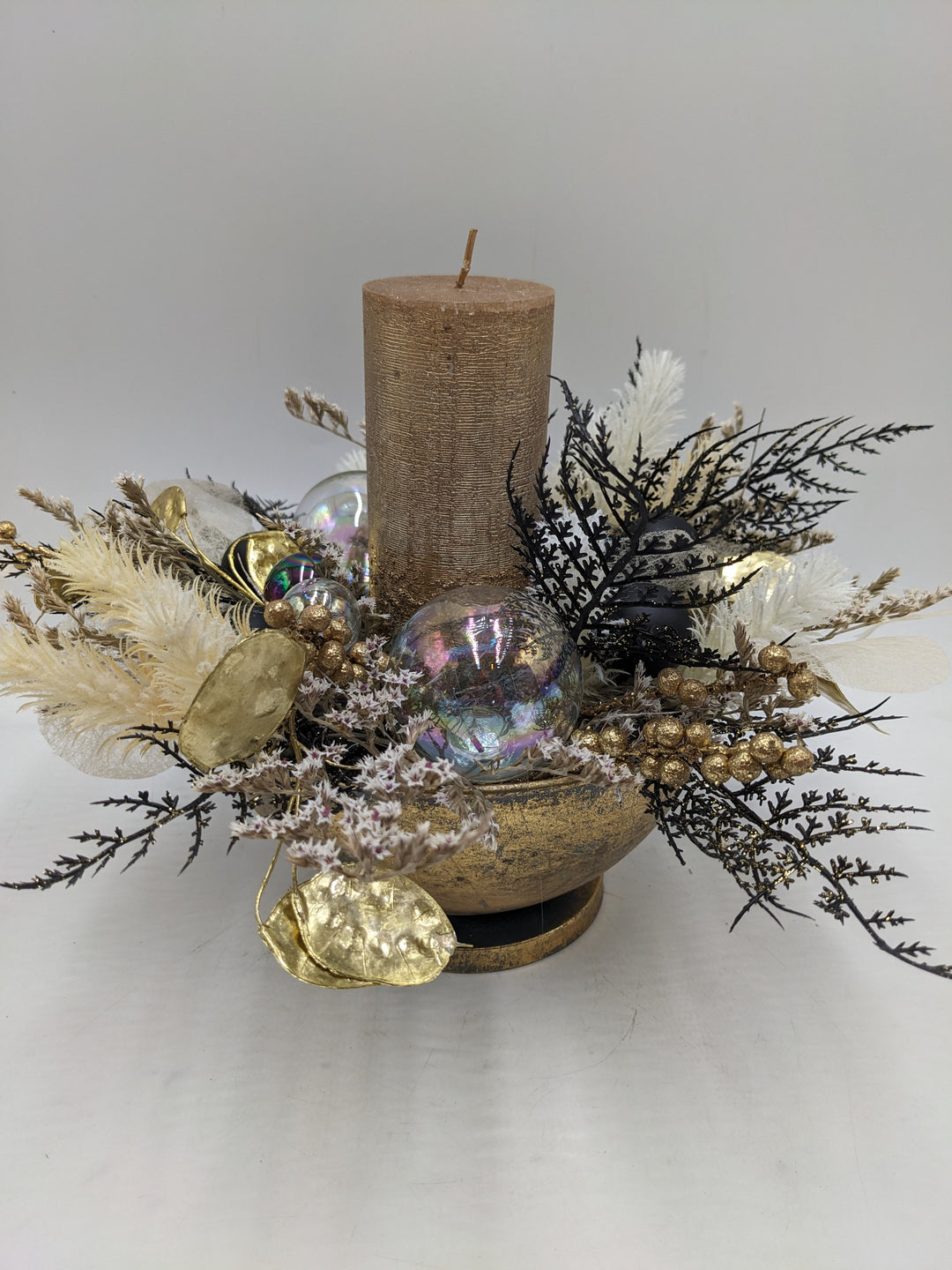 Weihnachtsgesteck Kugel Zapfen Zimt taupe