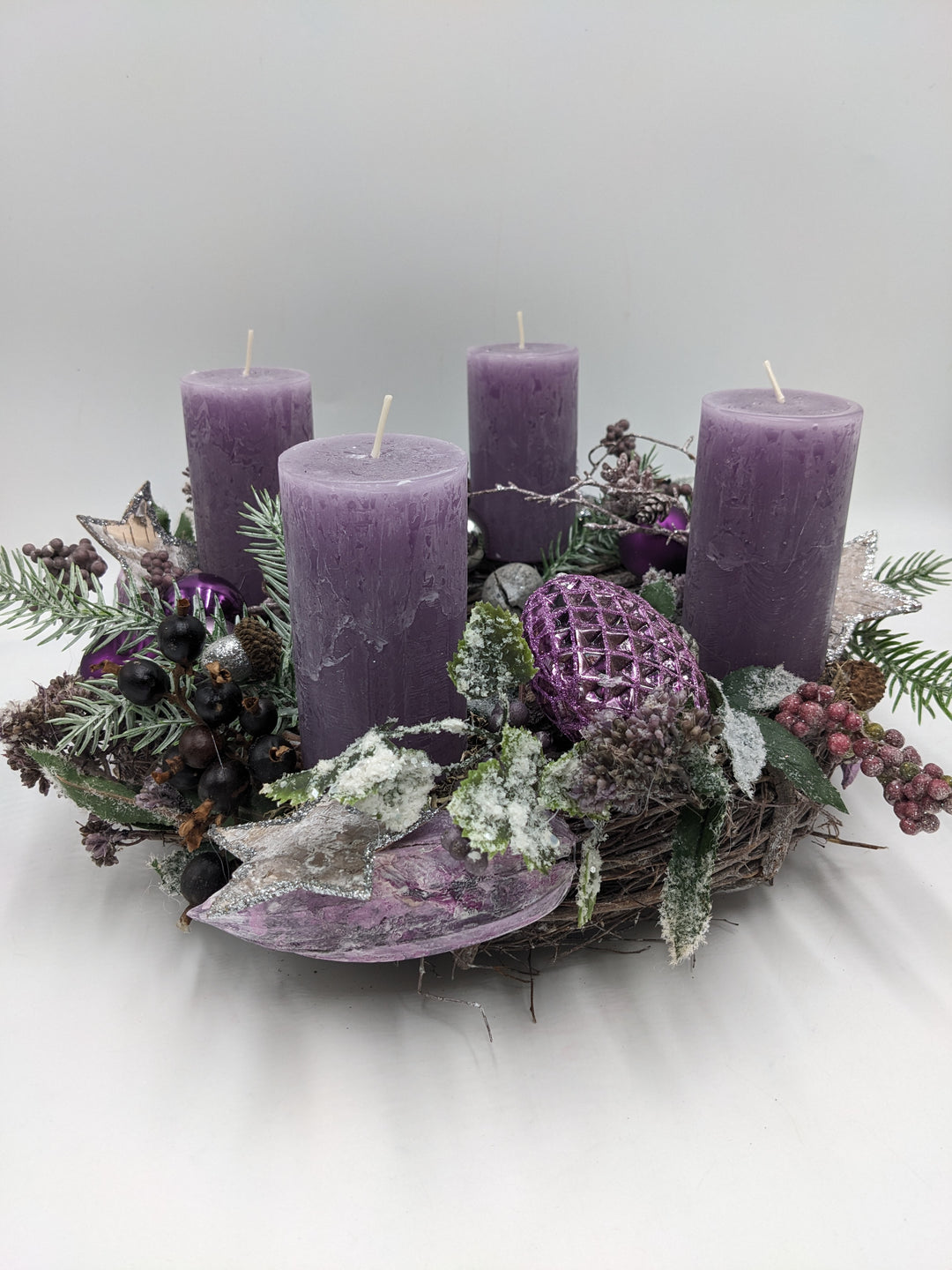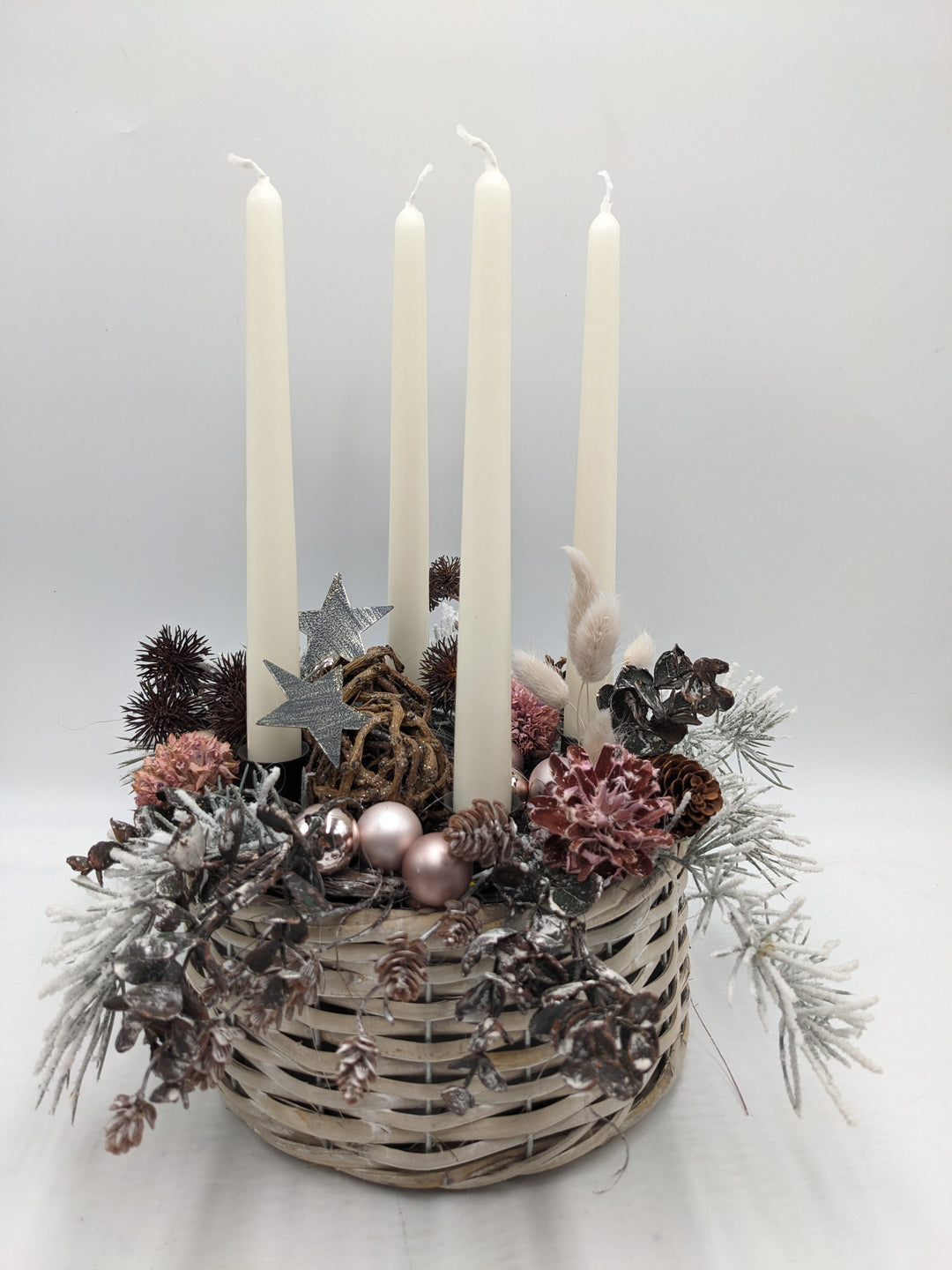 Adventsgesteck Kugel Zapfen Wichtel rosa