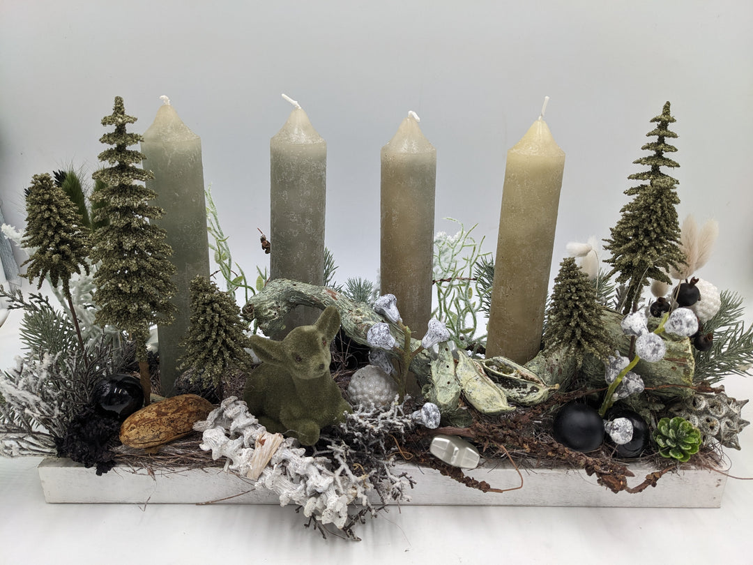 Adventsgesteck Kugel Rehkitz Tannenbäumchen grün