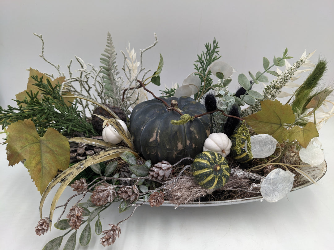 Herbstgesteck Kürbis Zapfen Eukalypthus grün