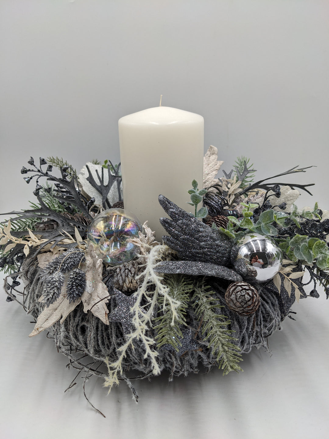 Adventsgesteck Frohes Fest Kugel Glocke weiß