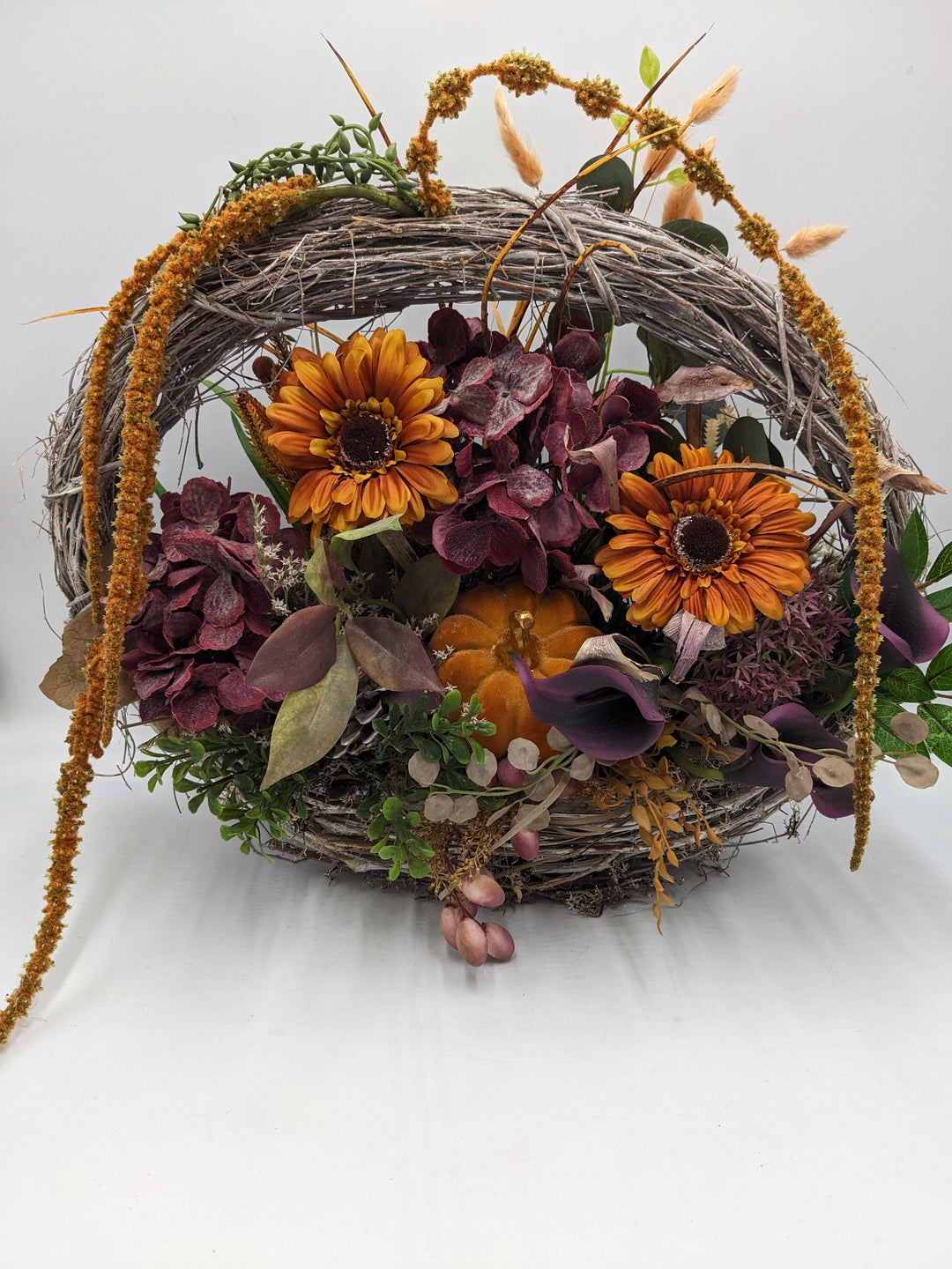 Herbstgesteck Kürbis Gerbera Hortensie orange