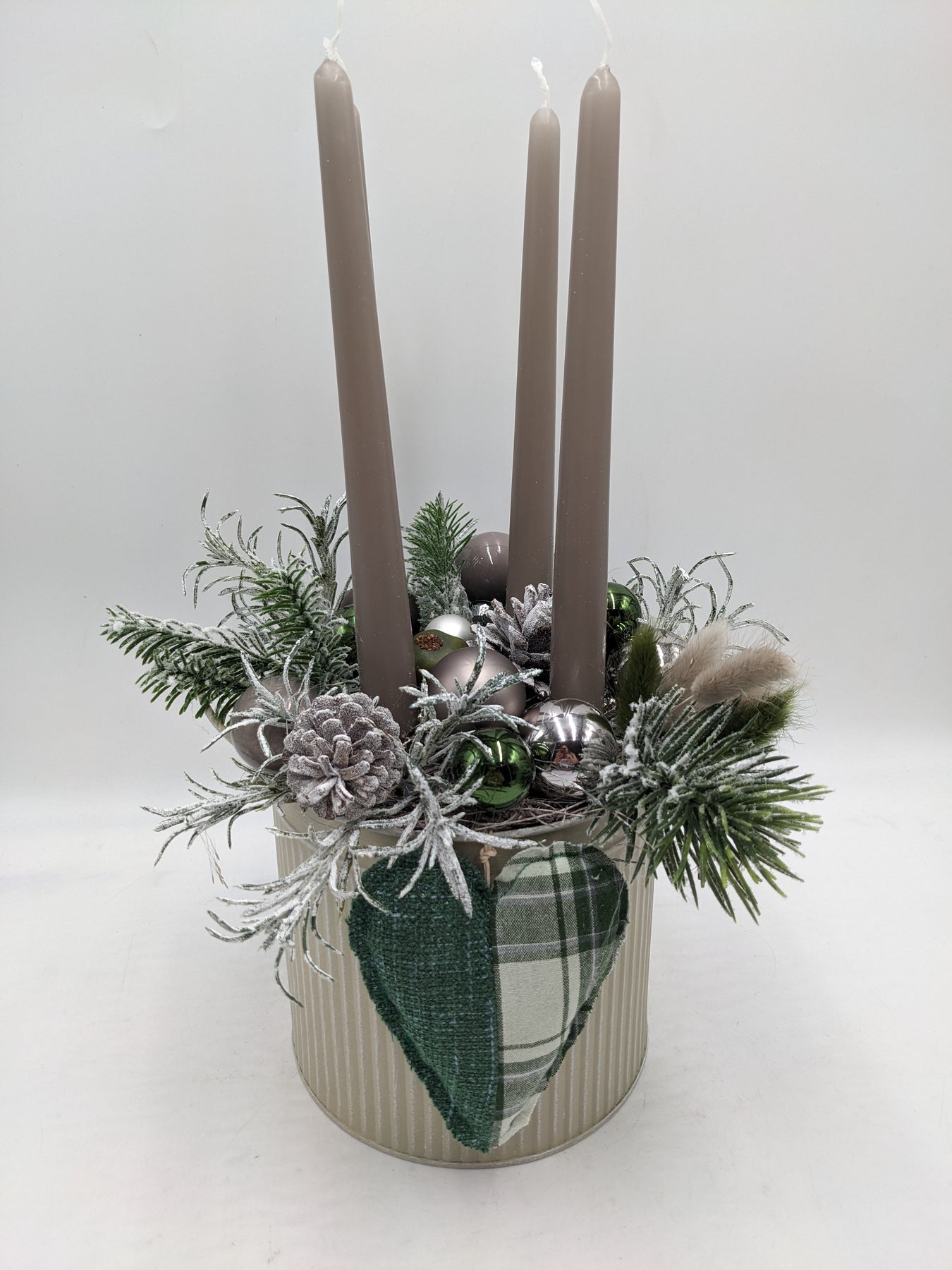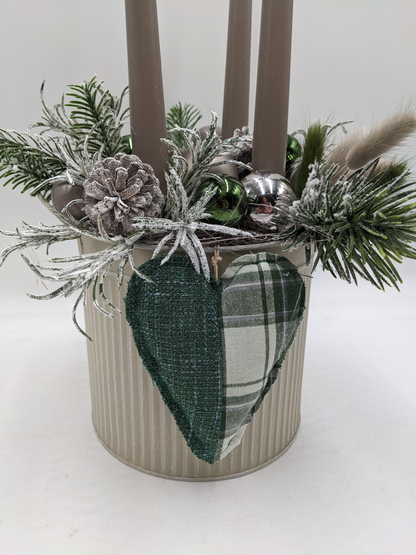 Tischgesteck im Topf mit Kerzen, Kugeln, Herz, Zapfen, Gräser und Tanne, Farbe: taupe, grün, silber, Höhe: ca. 42 cm, Durchmesser: ca. 17 cm, 3786-2025