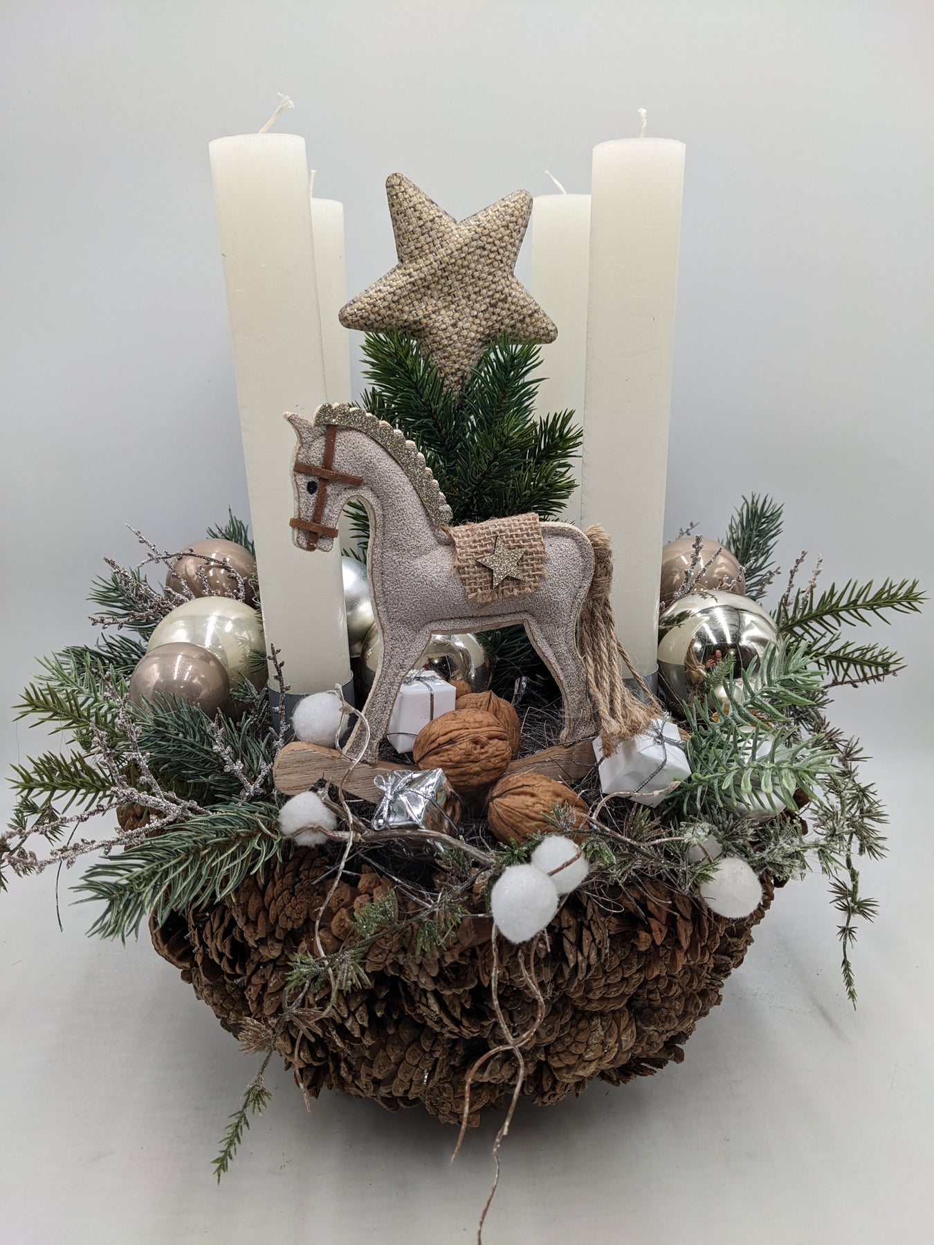 Adventsgesteck Kugel Schaukelpferd Stern creme