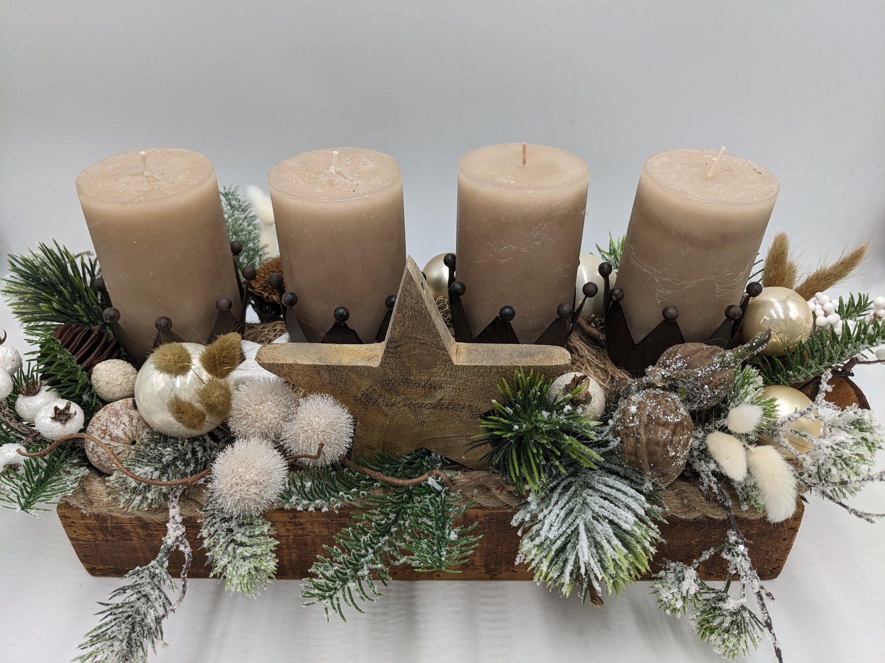 Tischgesteck im Tablett mit Kerzen, Kronen, Kugeln, Sterne, Walnüsse, Craspedia, Beeren, Gräser und Tanne, Farbe: taupe, creme, Höhe: ca. 22 cm, Breite: ca. 40 cm, Tiefe: ca. 14 cm, 3736-2025