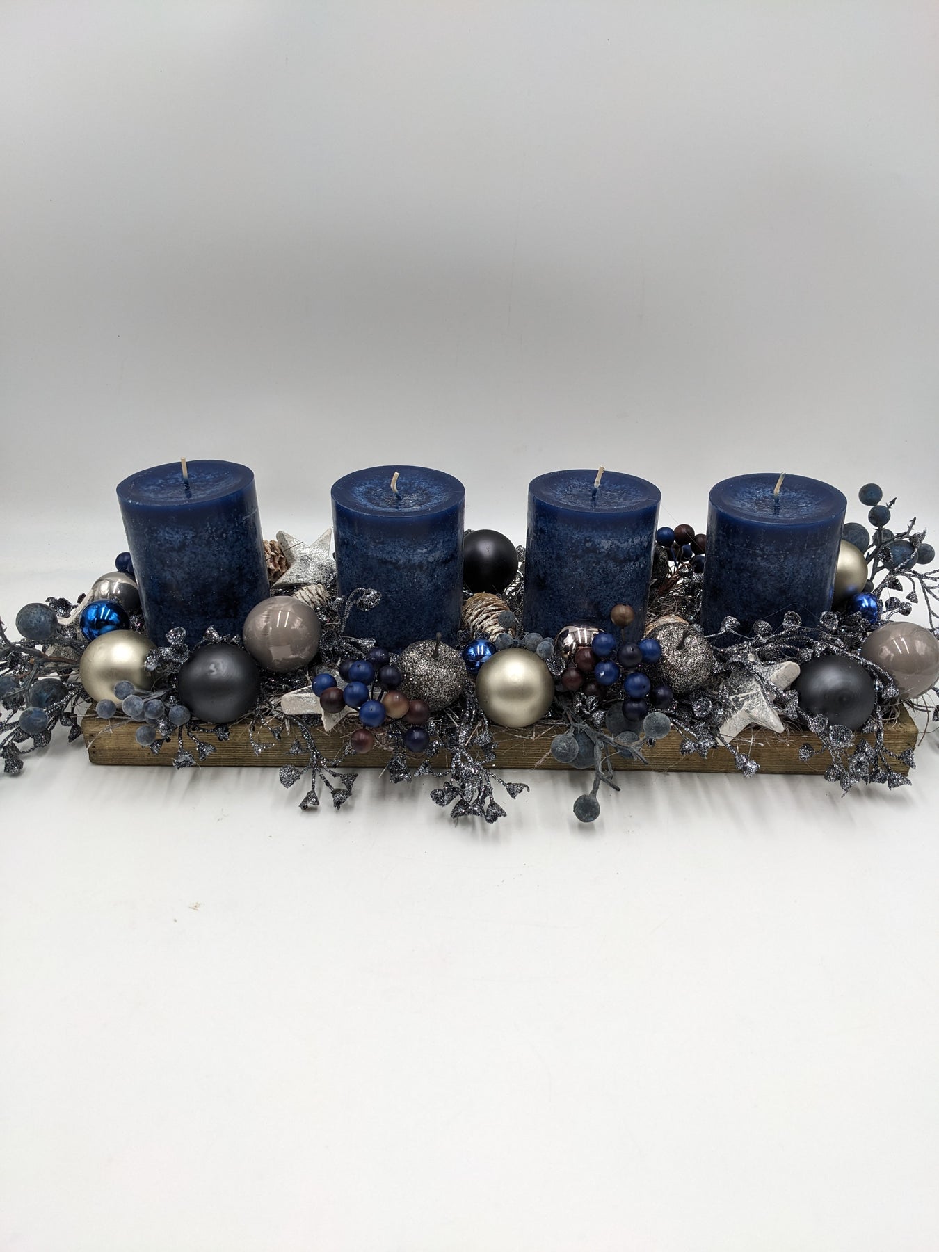 Tischgesteck im Tablett mit Kerzen, Kugeln, Sterne, Äpfel, Zapfen, Beeren und Gräser, Farbe: blau, anthrazit, Höhe: ca. 13 cm, Breite: ca. 42 cm, Tiefe: ca. 14 cm, 3870-2025