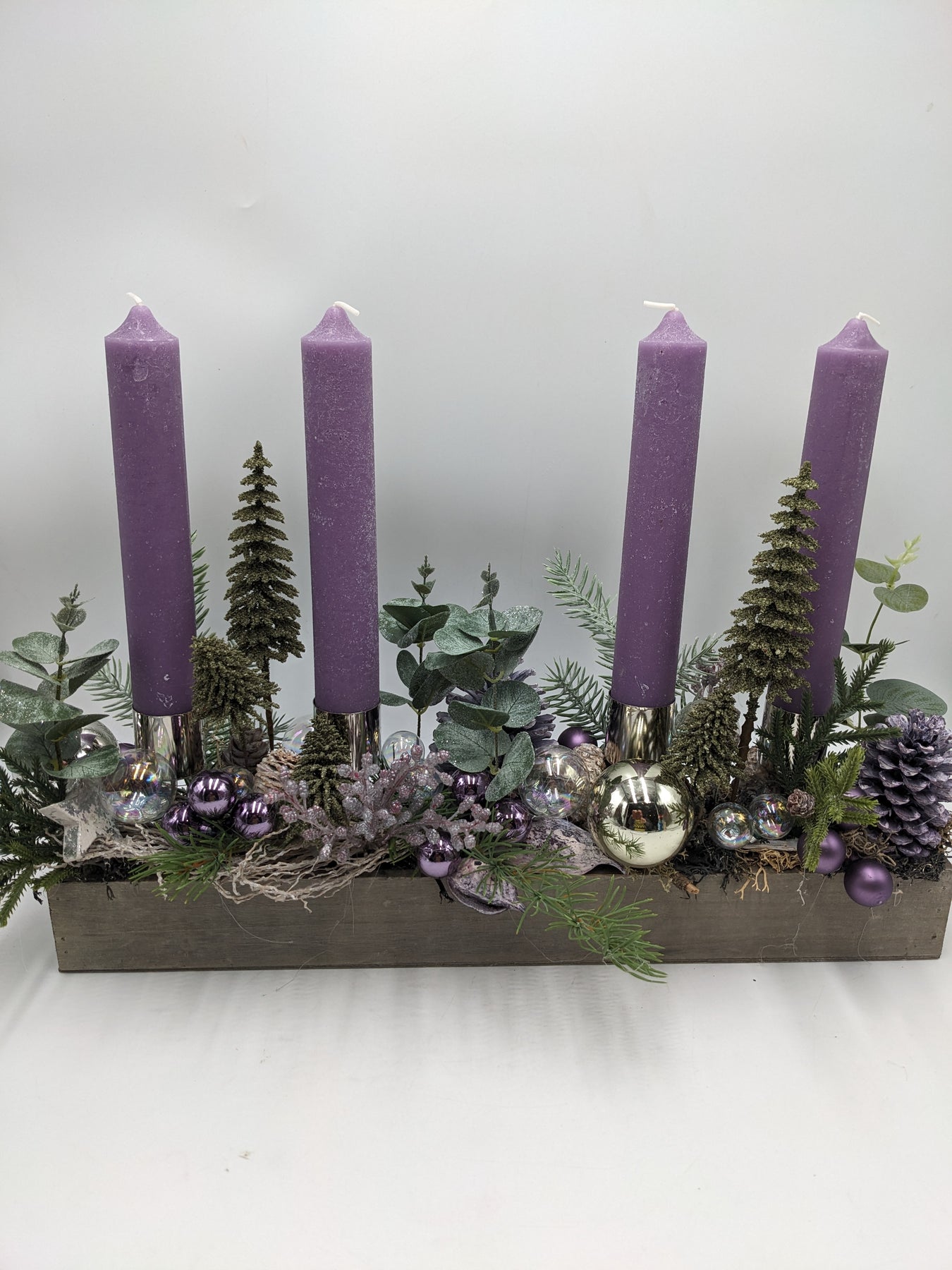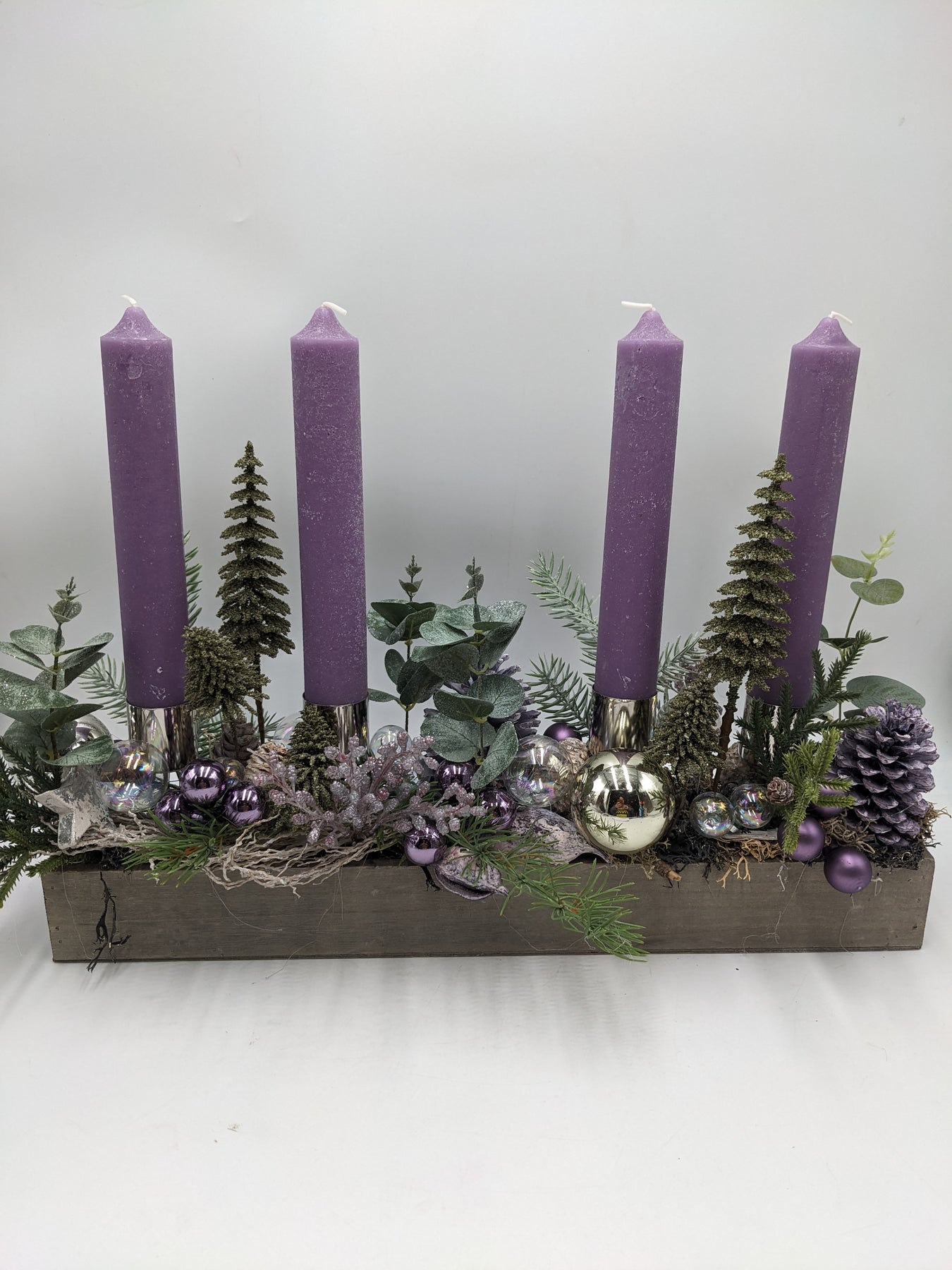 Tischgesteck im Tablett mit Kerzen, Kugeln, Zapfen, Sterne, Eukalypthus, Tannenbäumchen, Beeren und Tanne, Farbe: lila, grün, Höhe: ca. 36 cm, Breite: ca. 50 cm, Tiefe 9 cm, 3834-2025