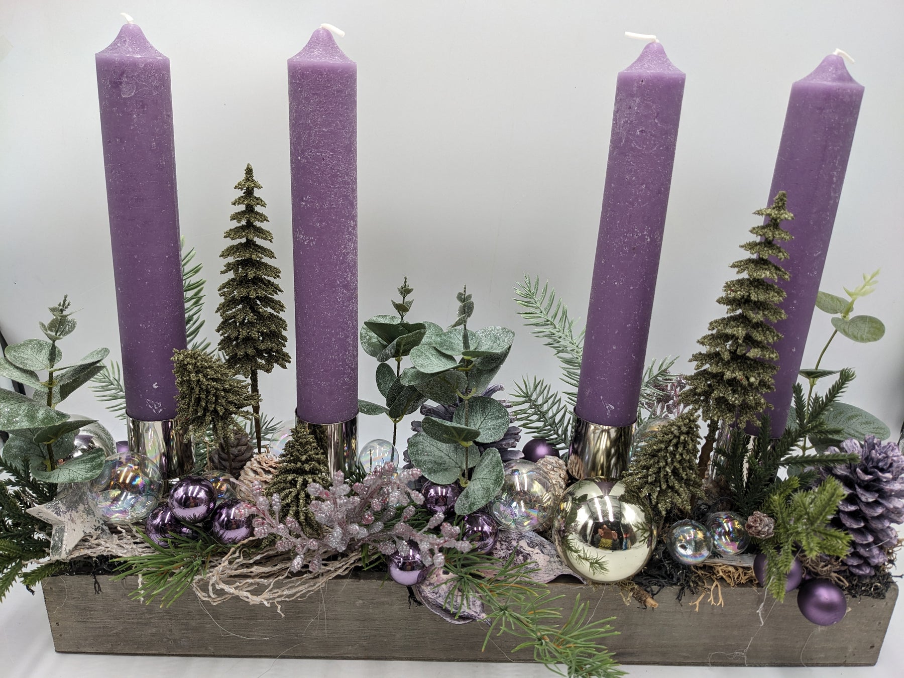 Adventsgesteck Kugel Zapfen Eukalypthus lila