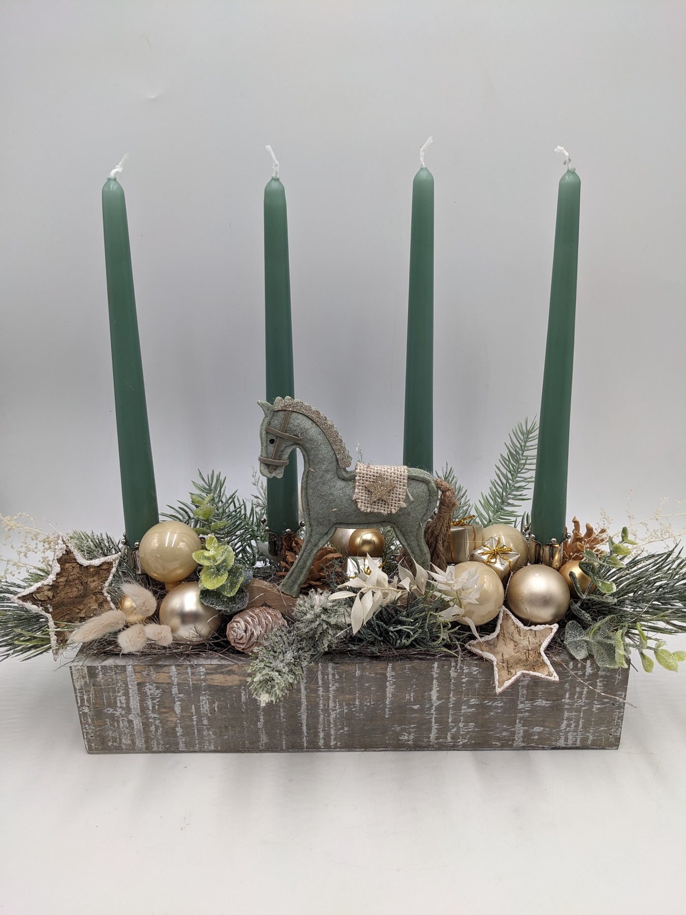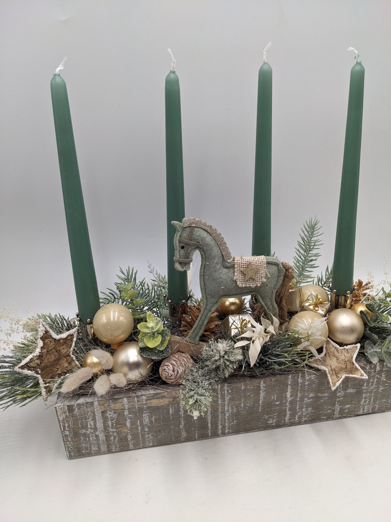 Tischgesteck im Tablett mit Kerzen, Kugeln, Sterne, Schaukelpferd, Zapfen, Eukalypthus und Tanne, Farbe: salbei, creme, mint, 3790-2025