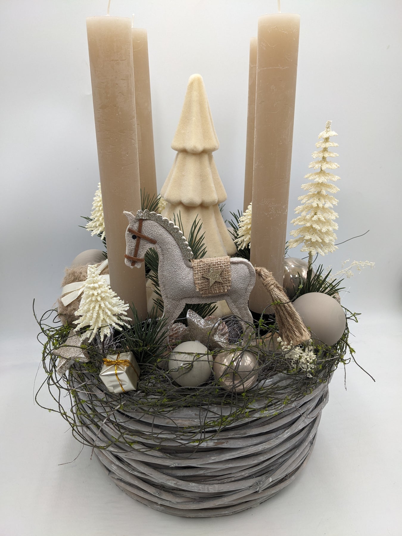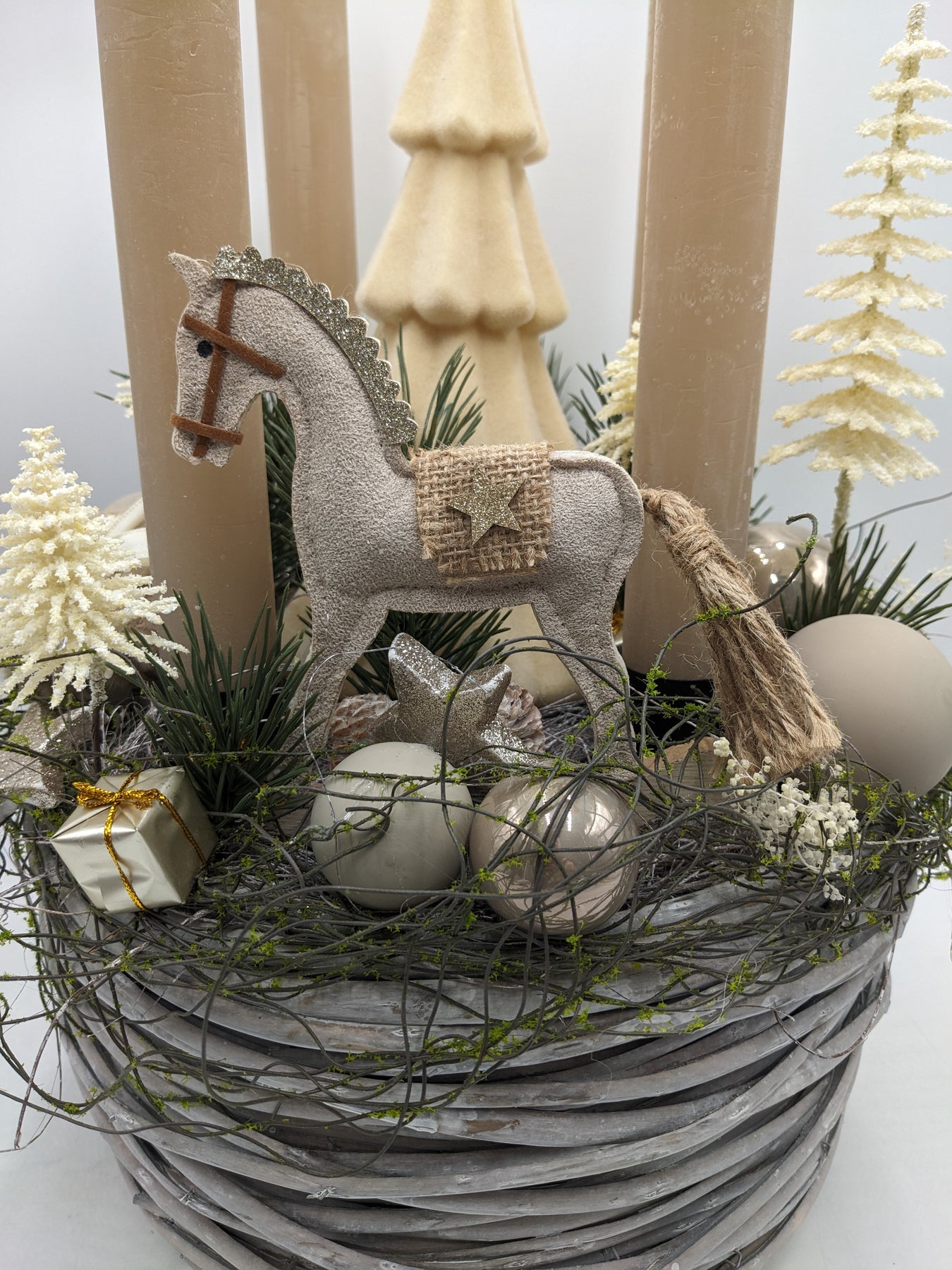 Adventskranz Kugel Schaukelpferd Tannenbäumchen creme