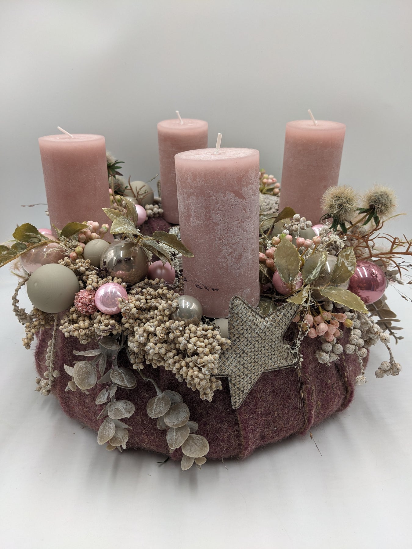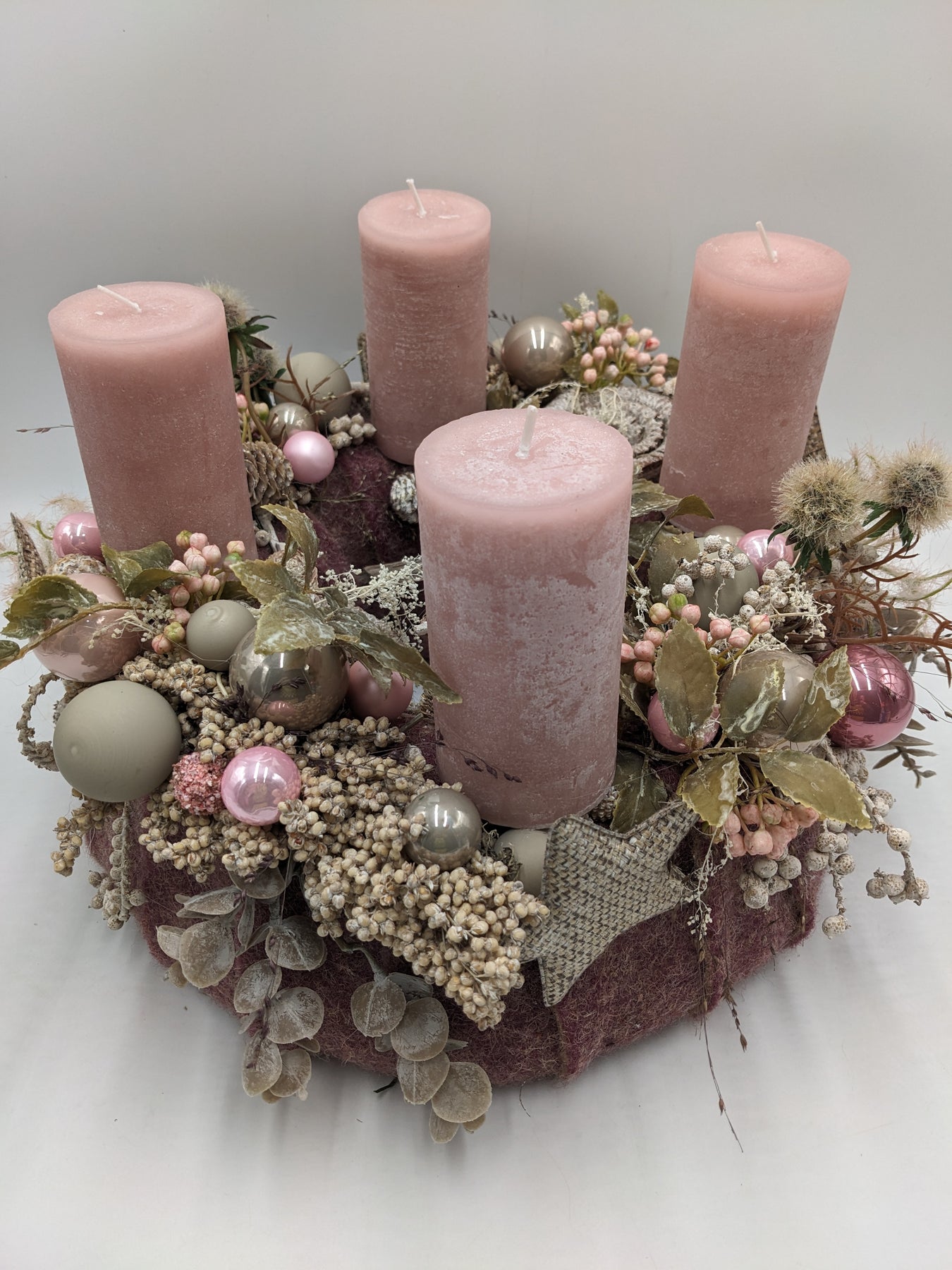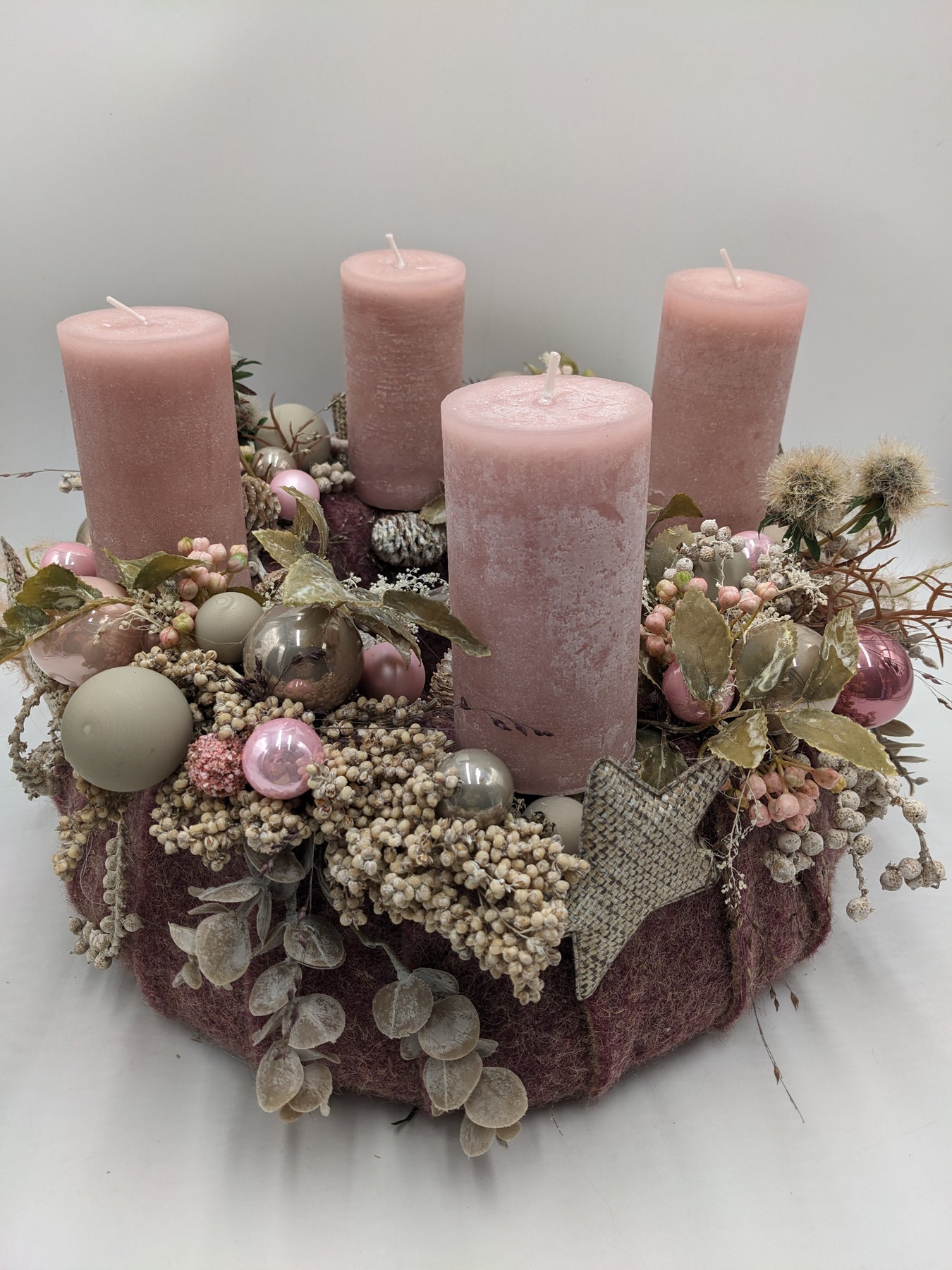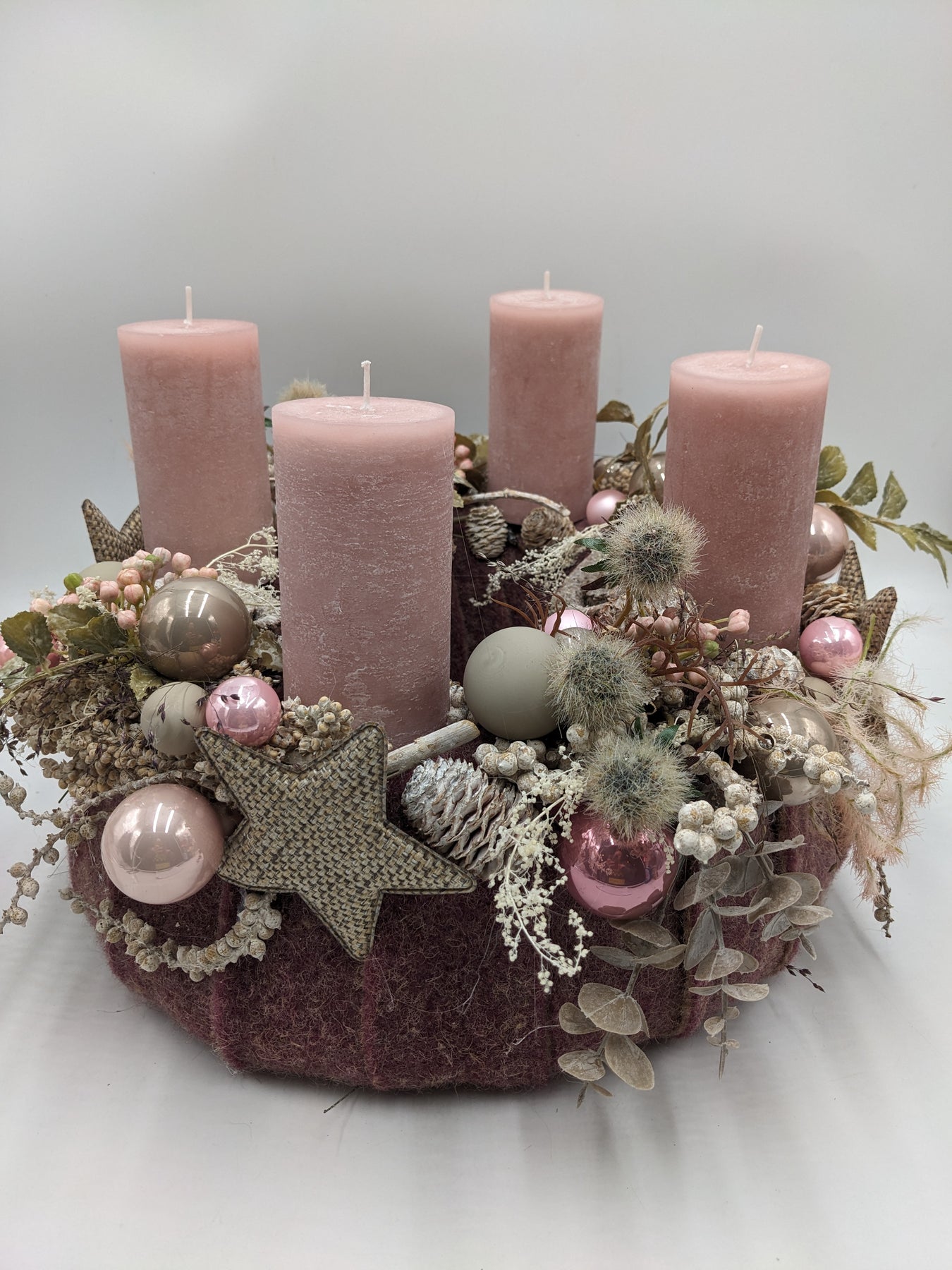 Tischkranz mit Kerzen, Kugeln, Sterne, Zapfen, Eukalypthus, Beeren und Gräser, Farbe: rosa, taupe, Höhe: ca. 26 cm, Durchmesser: ca. 36 cm, 3856-2025