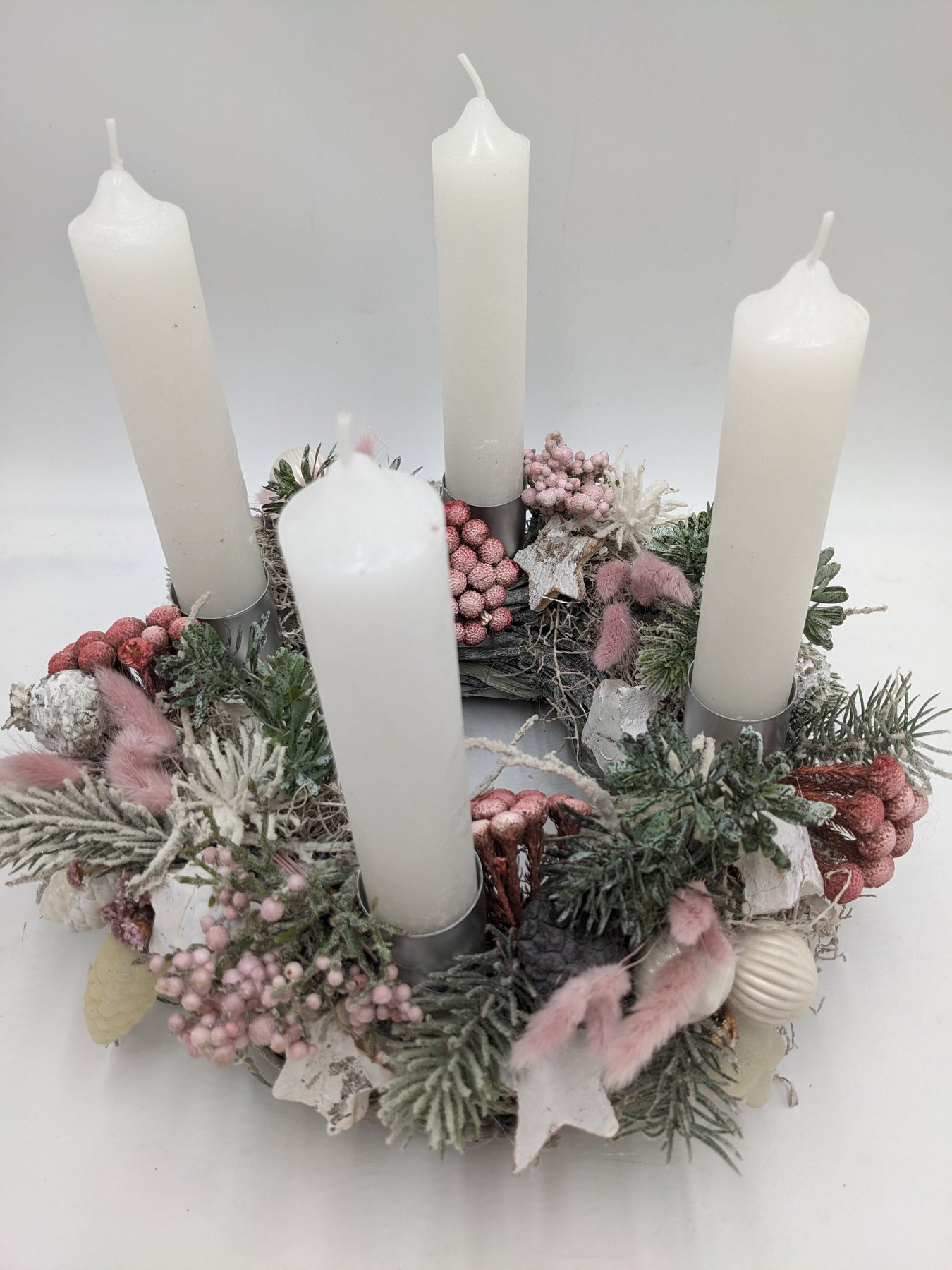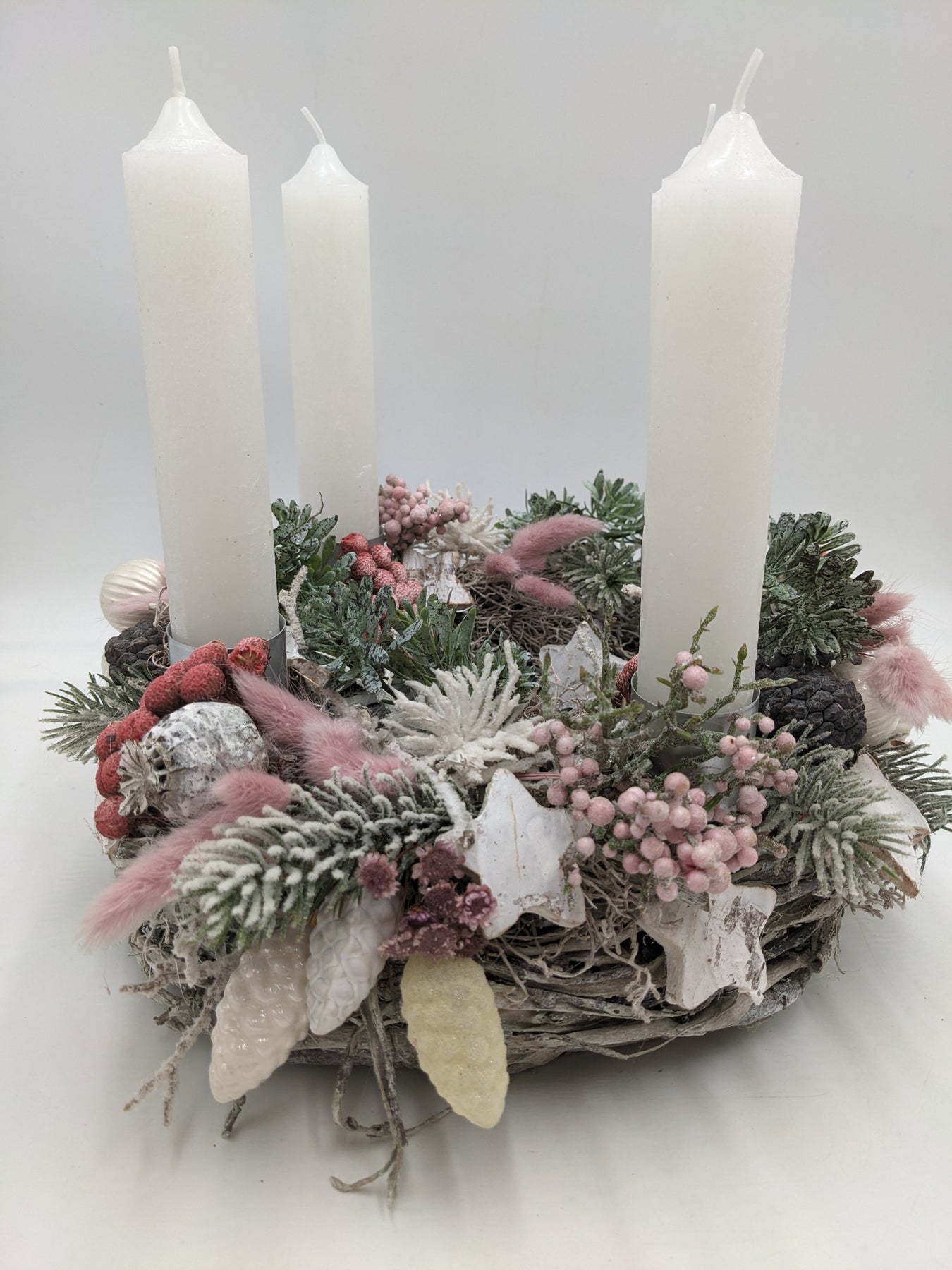 Tischkranz mit Kerzen, Kugeln, Sterne, Zapfen, Beeren, Gräser und Tanne, Farbe: rosa, weiß, Höhe: ca. 30 cm, Durchmesser: ca. 30 cm, 3452-2025