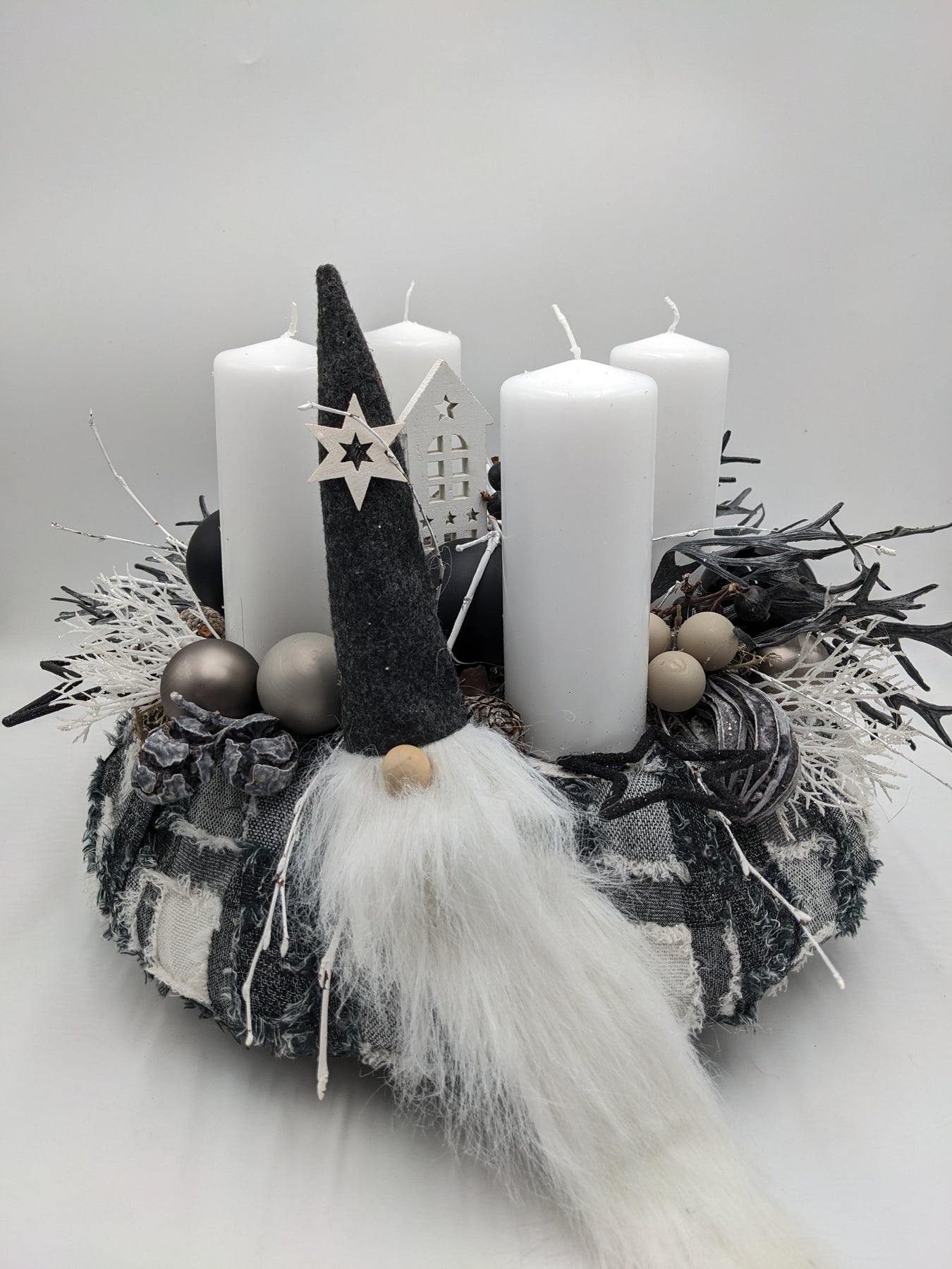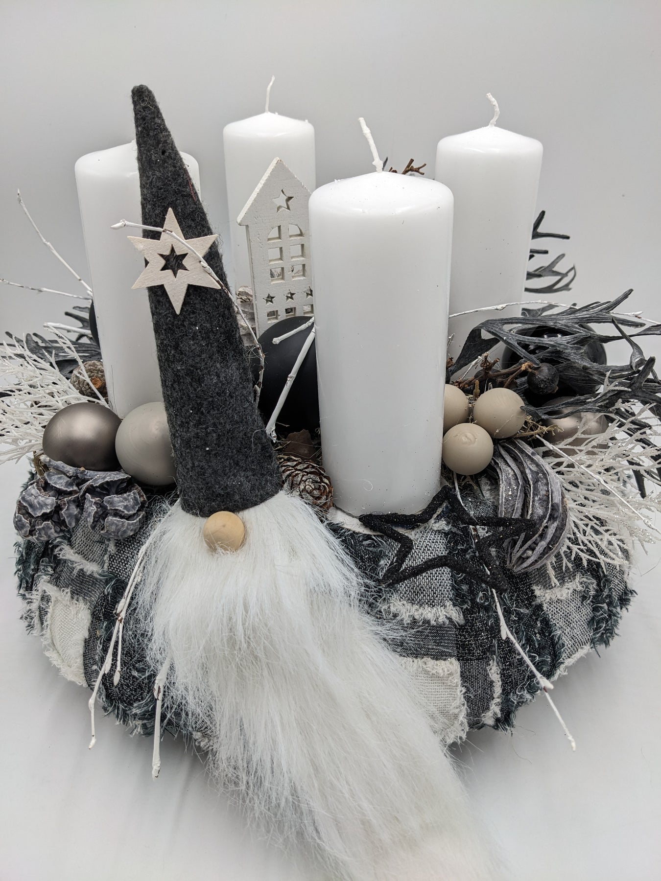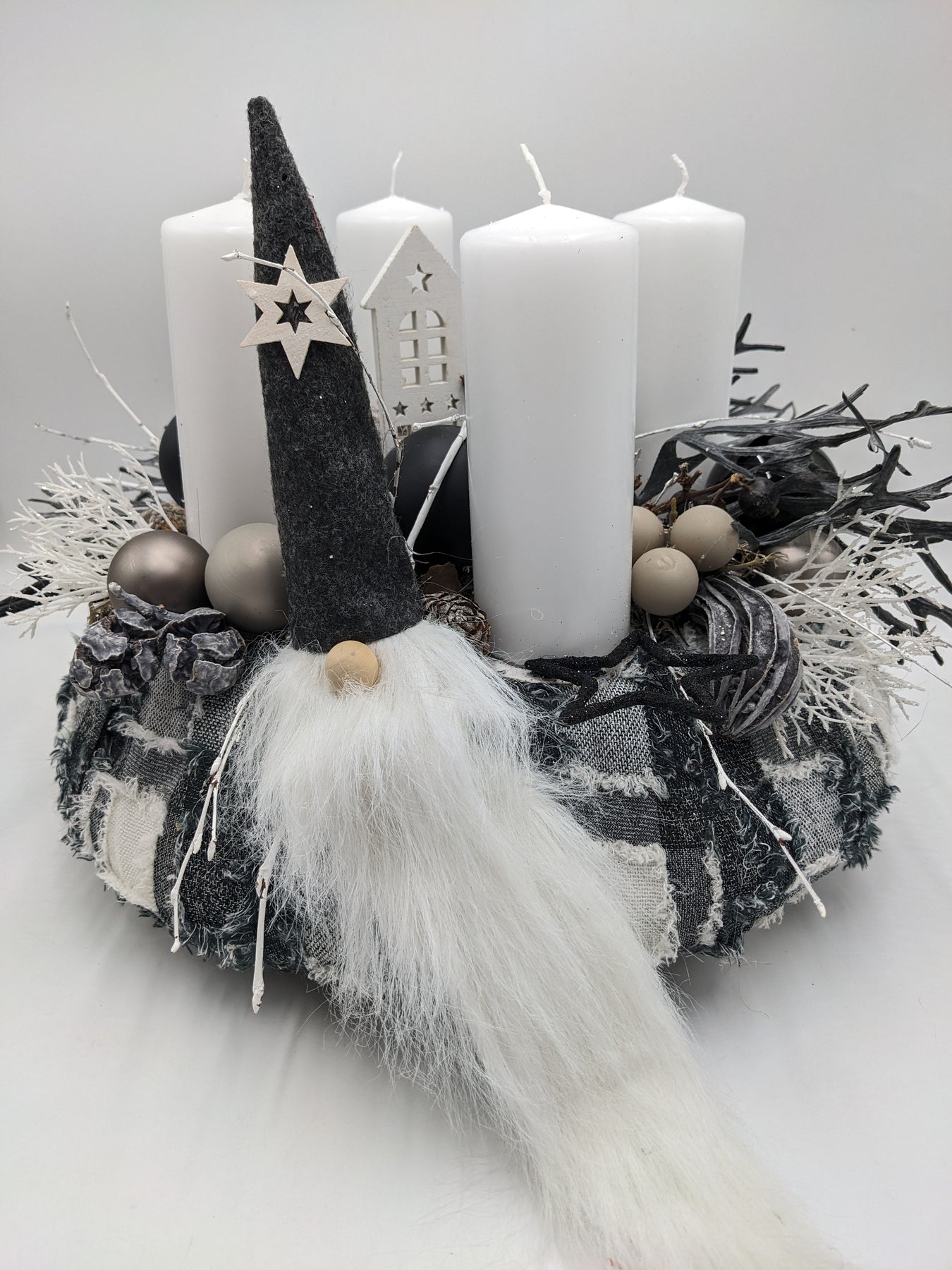 Adventskranz mit Kerzen, Kugeln, Sterne, Wichtel, Haus, Geäst und Gräser, Farbe: schwarz, weiß, Höhe: ca. 27 cm, Durchmesser: ca. 36 cm, 3939-2025