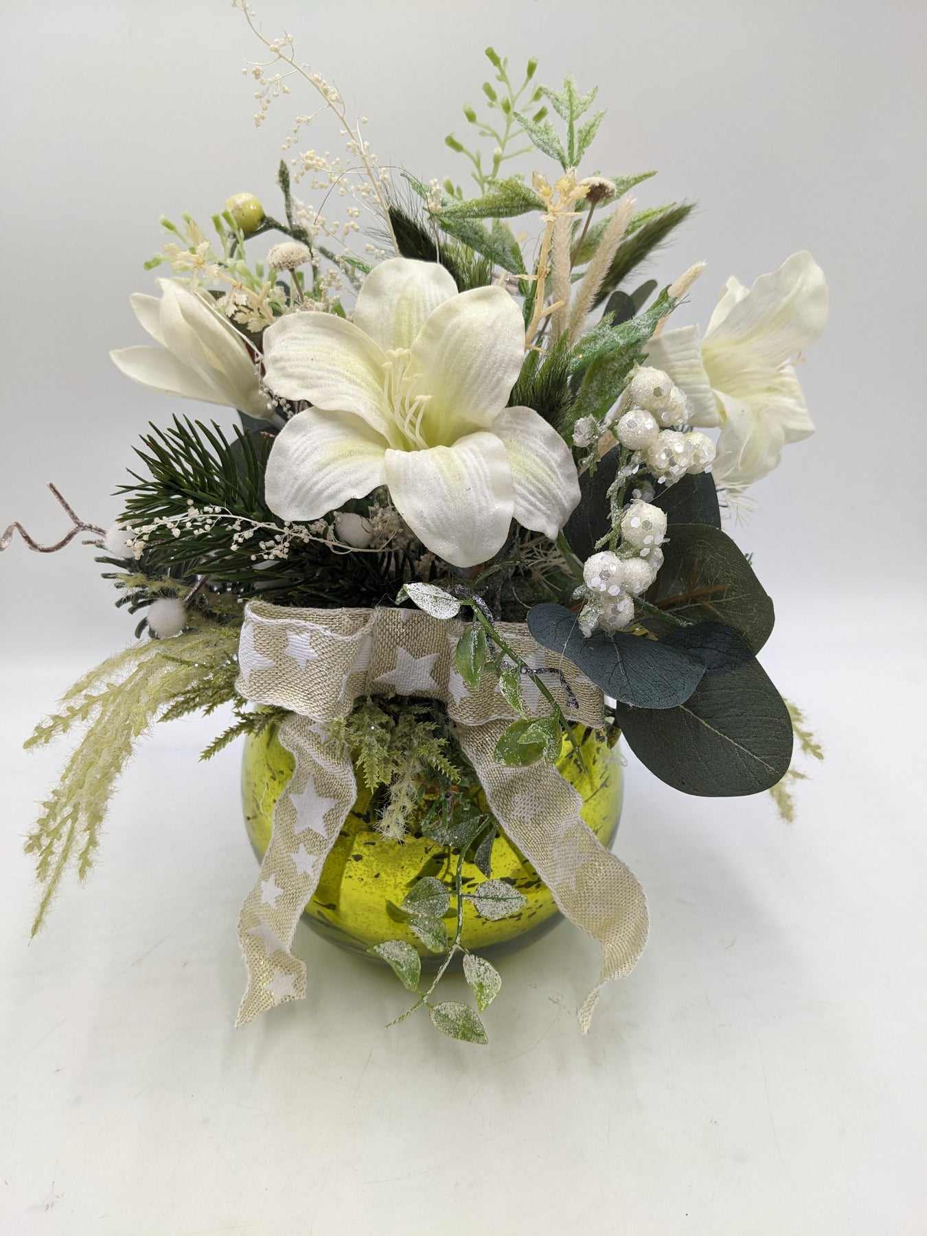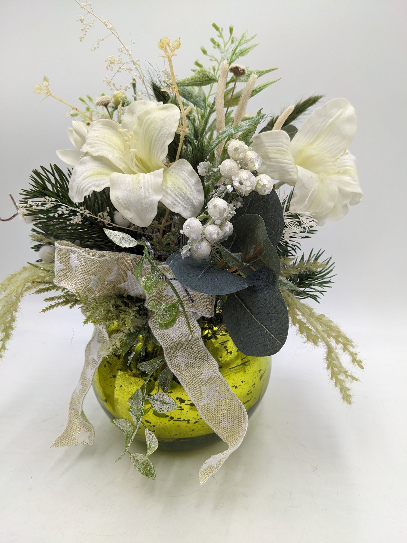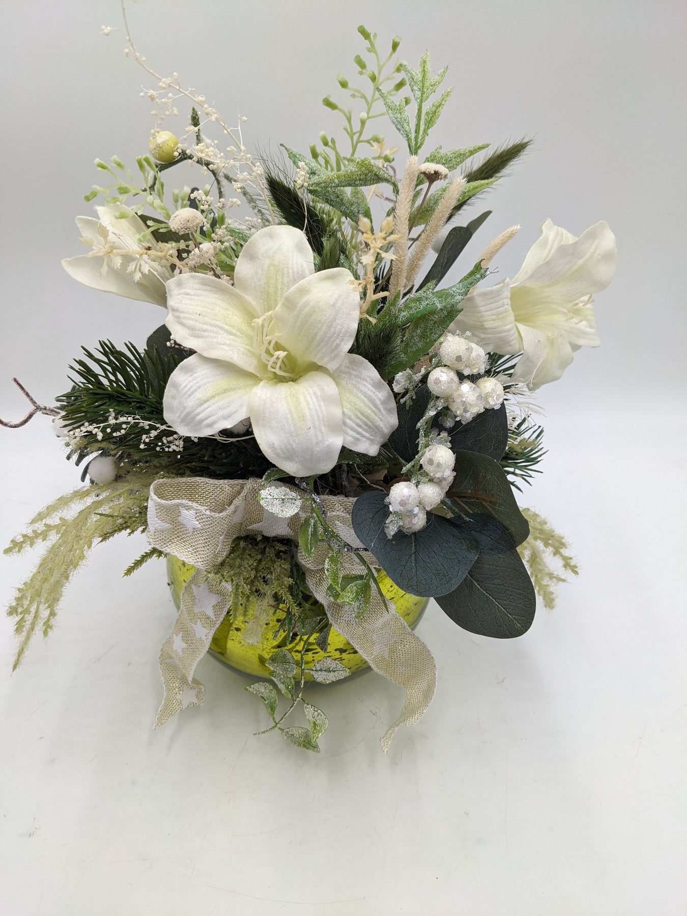 Tischgesteck im Topf, Schleife, Amaryllis, Beeren, Gräser und Tanne, Farbe: grün, weiß, Höhe: ca. 28 cm, Durchmesser: ca. 14 cm, 3950-2025