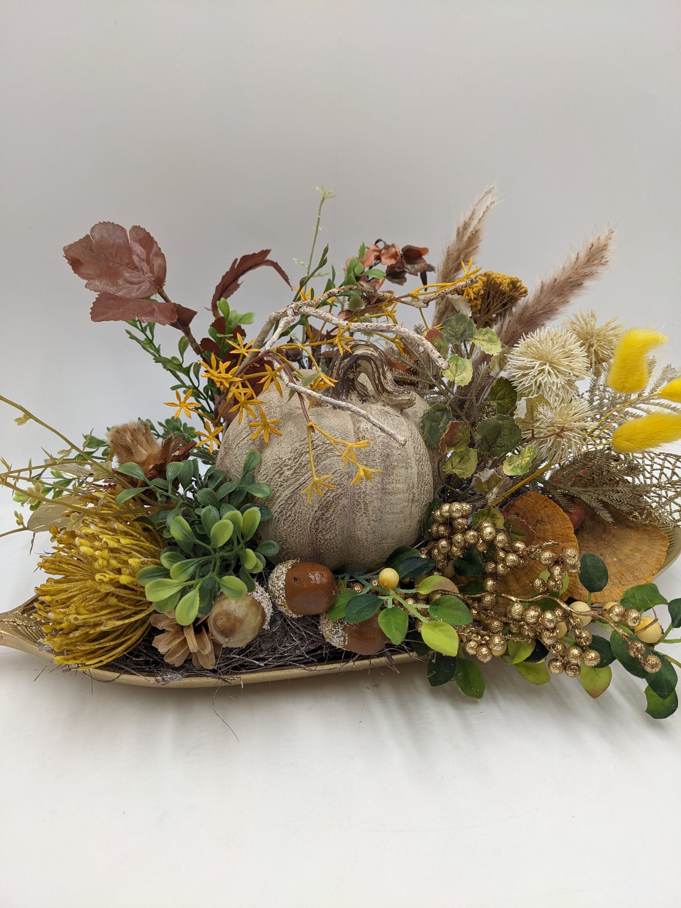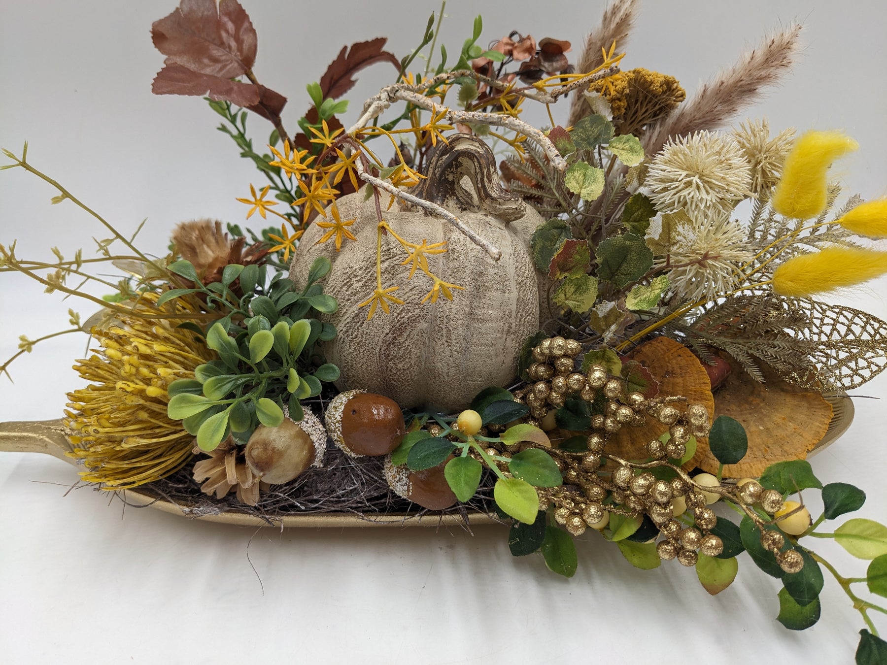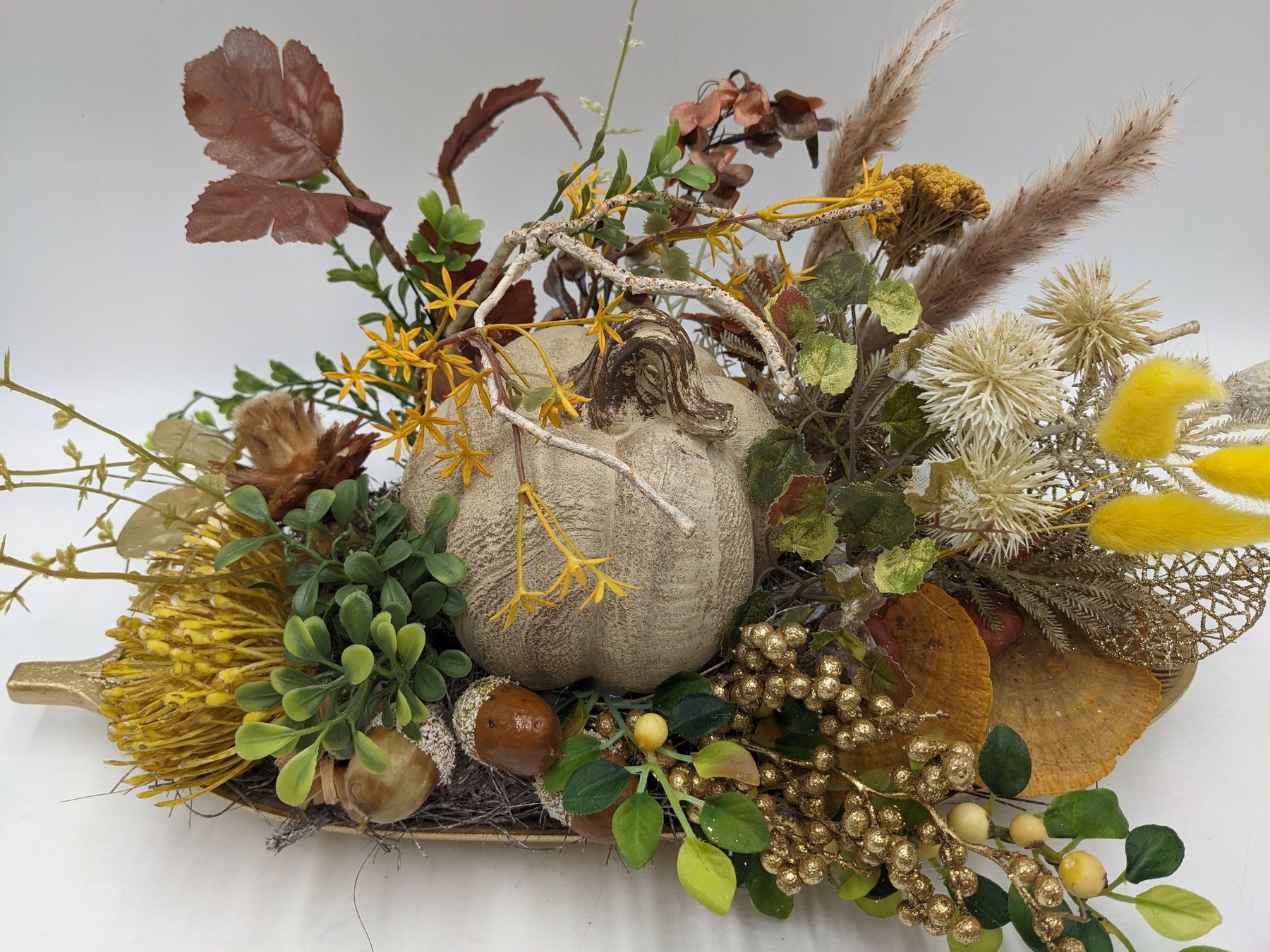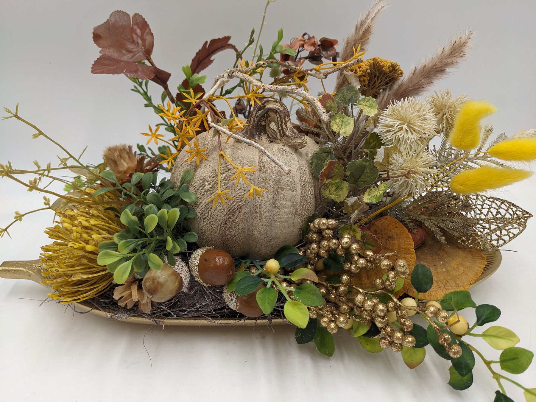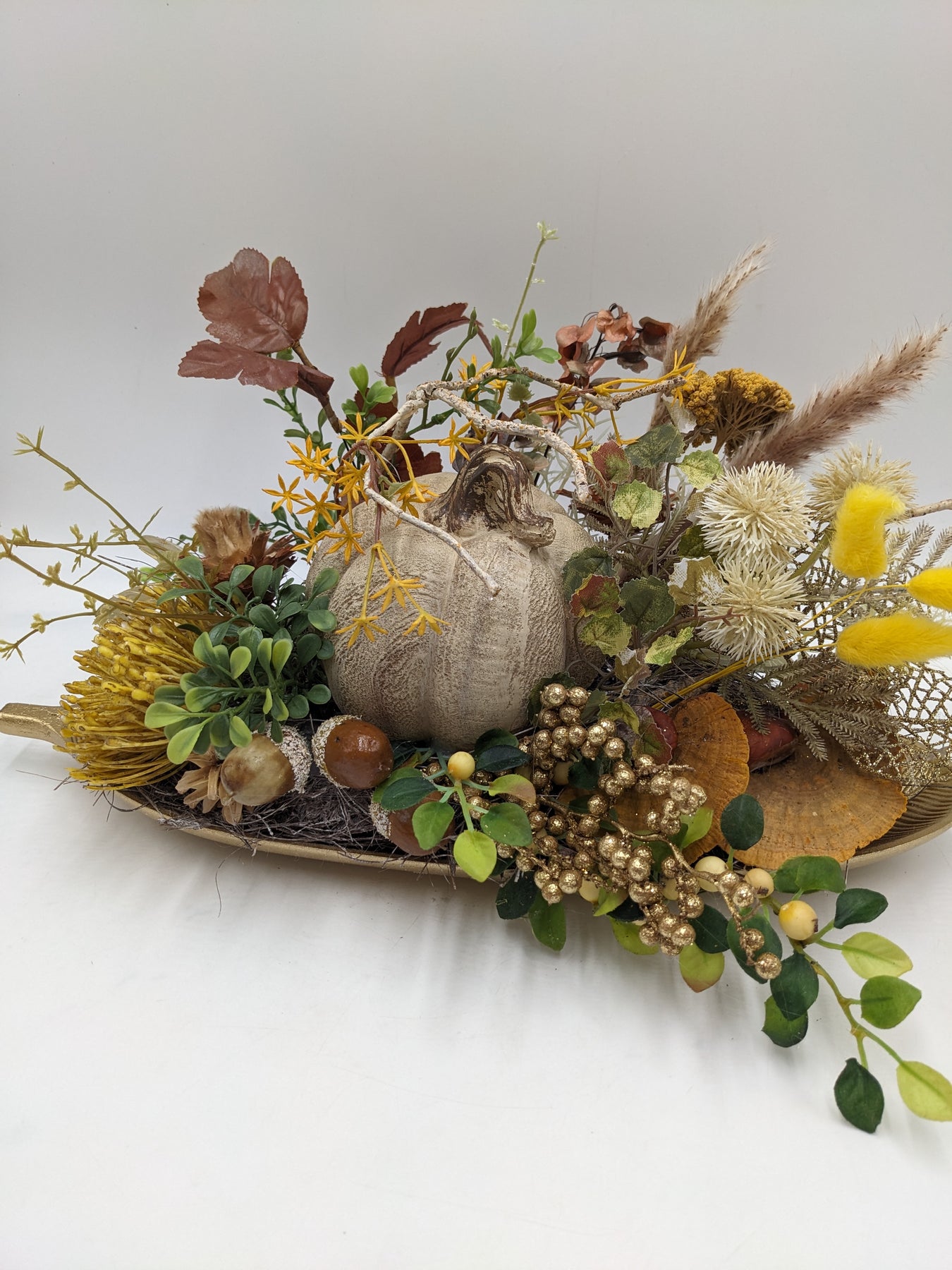Tischgesteck im Tablett, Kürbis, Eicheln, Spider, Beeren und Gräser, Farbe: natur, creme, gold, Höhe: ca. 21 cm, Breite: ca. 40 cm, 3714-2025