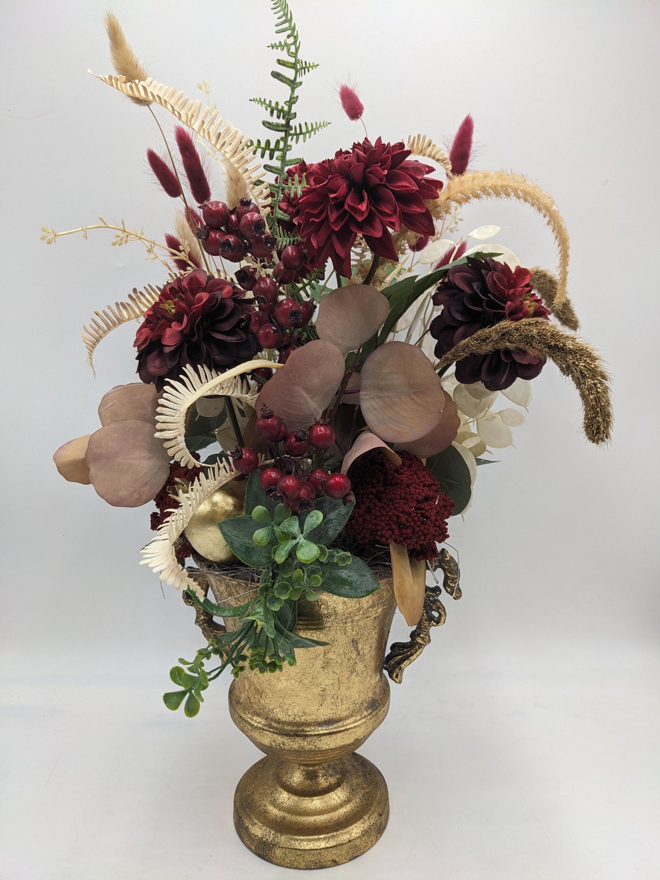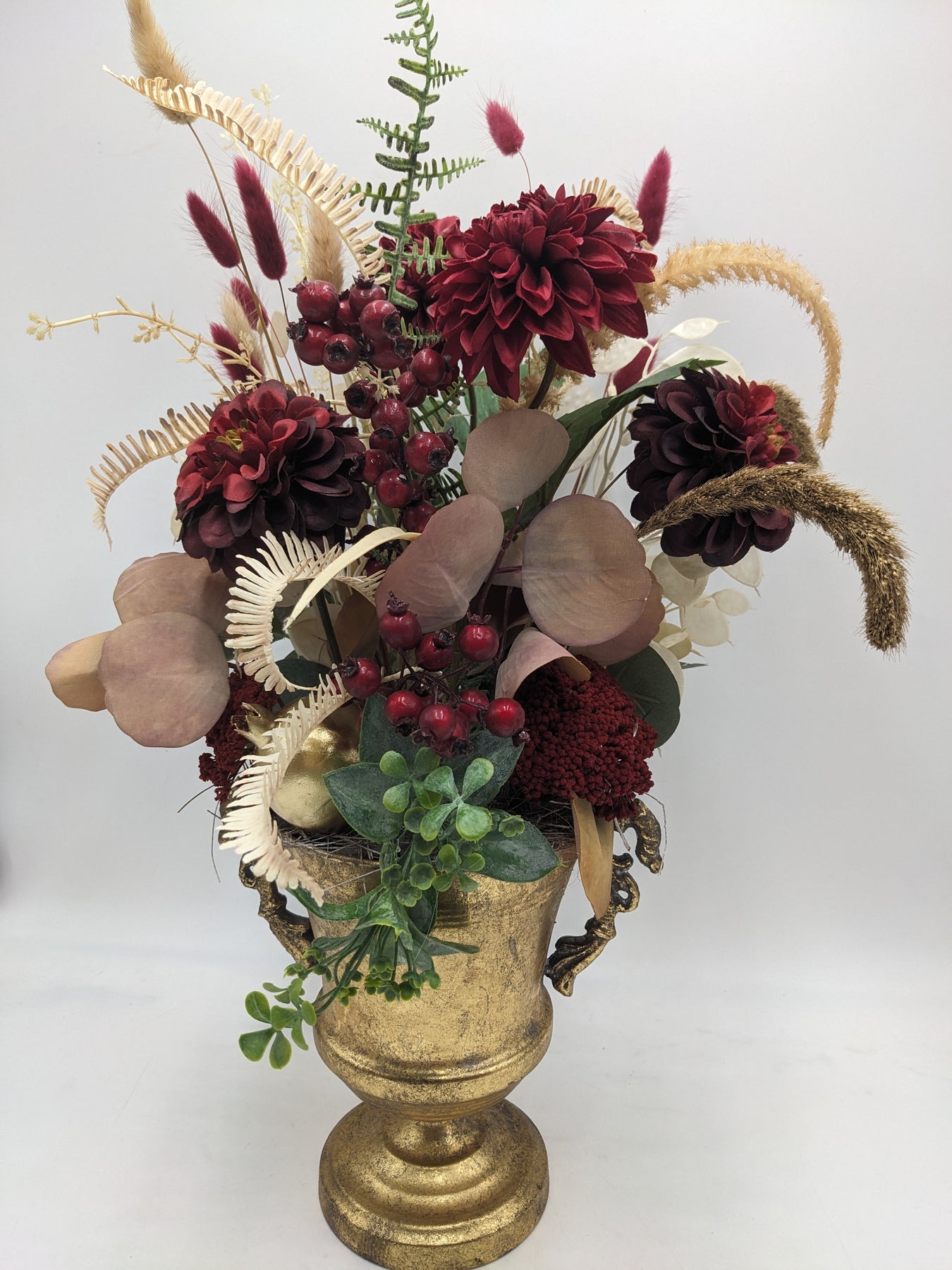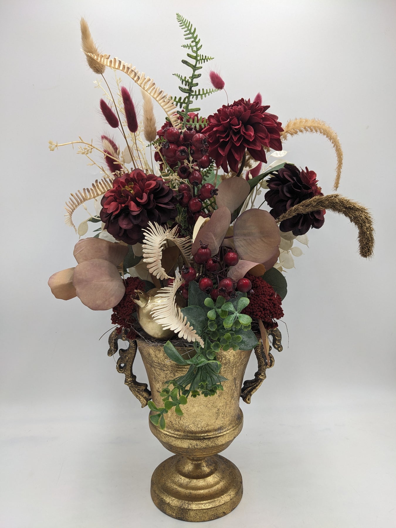 Tischgesteck im Pokal, Granatpafel, Dahlien, Beeren, Farn und Gräser, Farbe: rot, gold, Höhe: ca. 52 cm, Breite: ca. 22 cm, 3520-2025