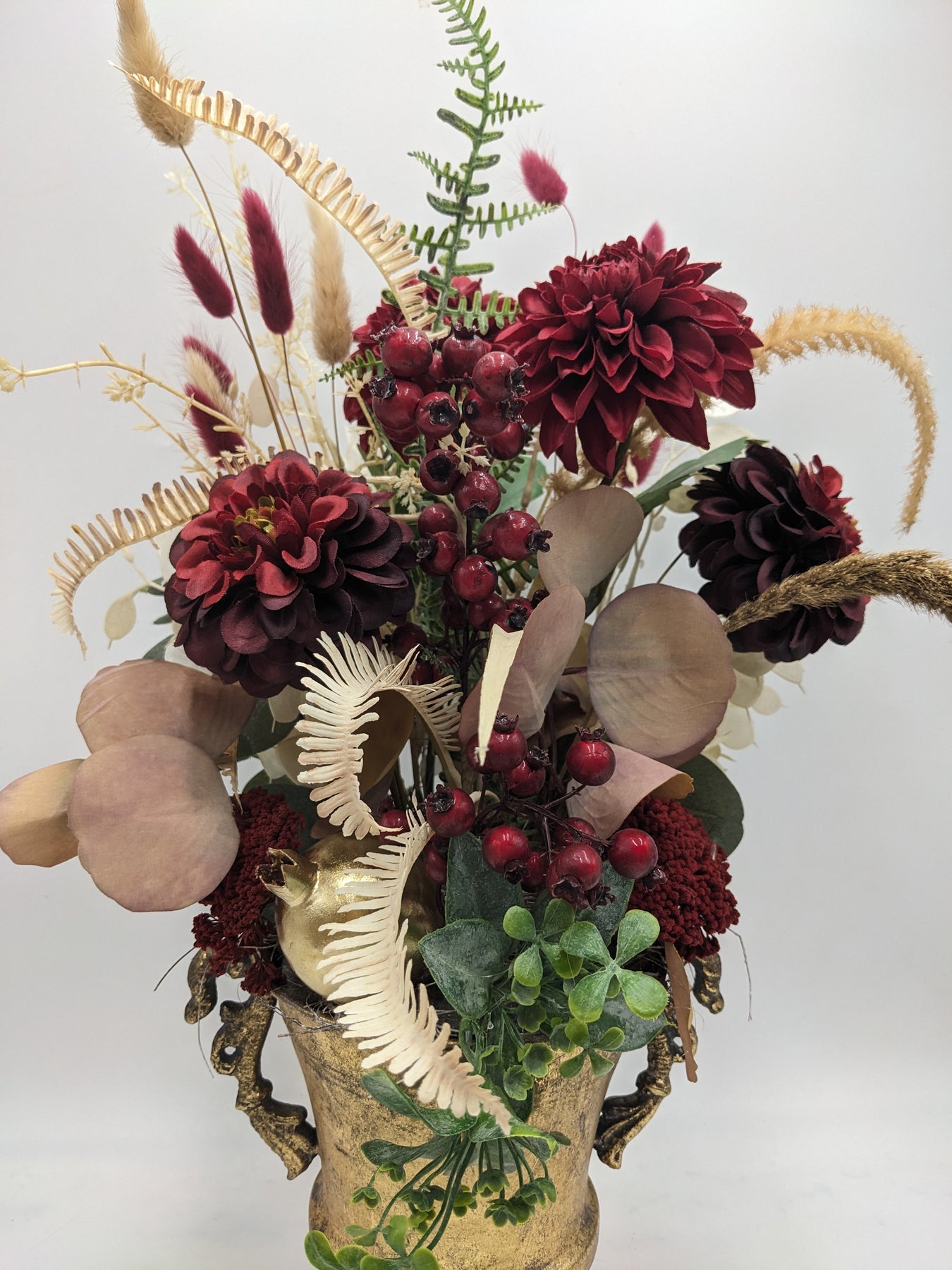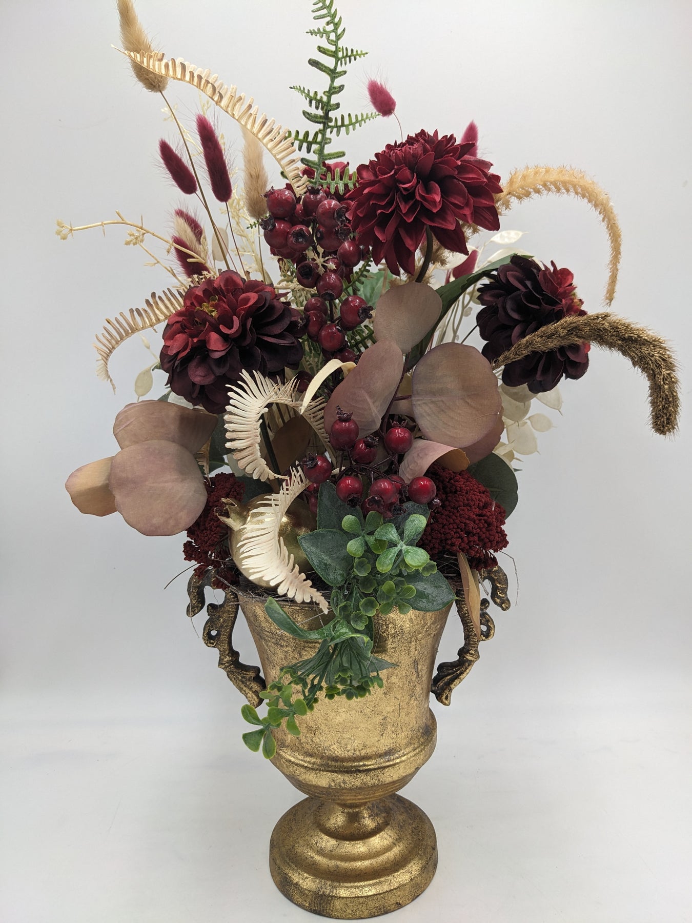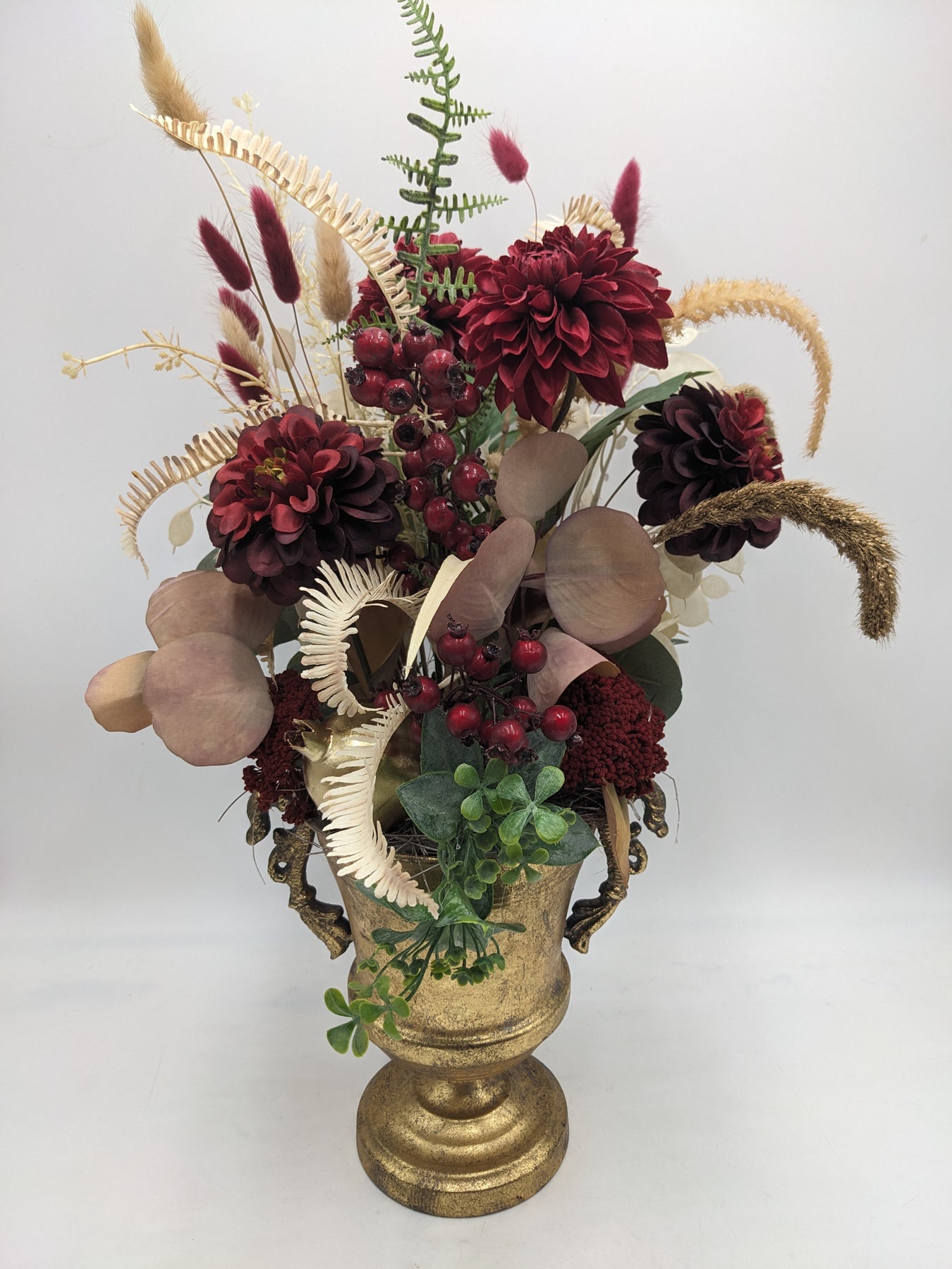 Tischgesteck im Pokal, Granatpafel, Dahlien, Beeren, Farn und Gräser, Farbe: rot, gold, Höhe: ca. 52 cm, Breite: ca. 22 cm, 3520-2025