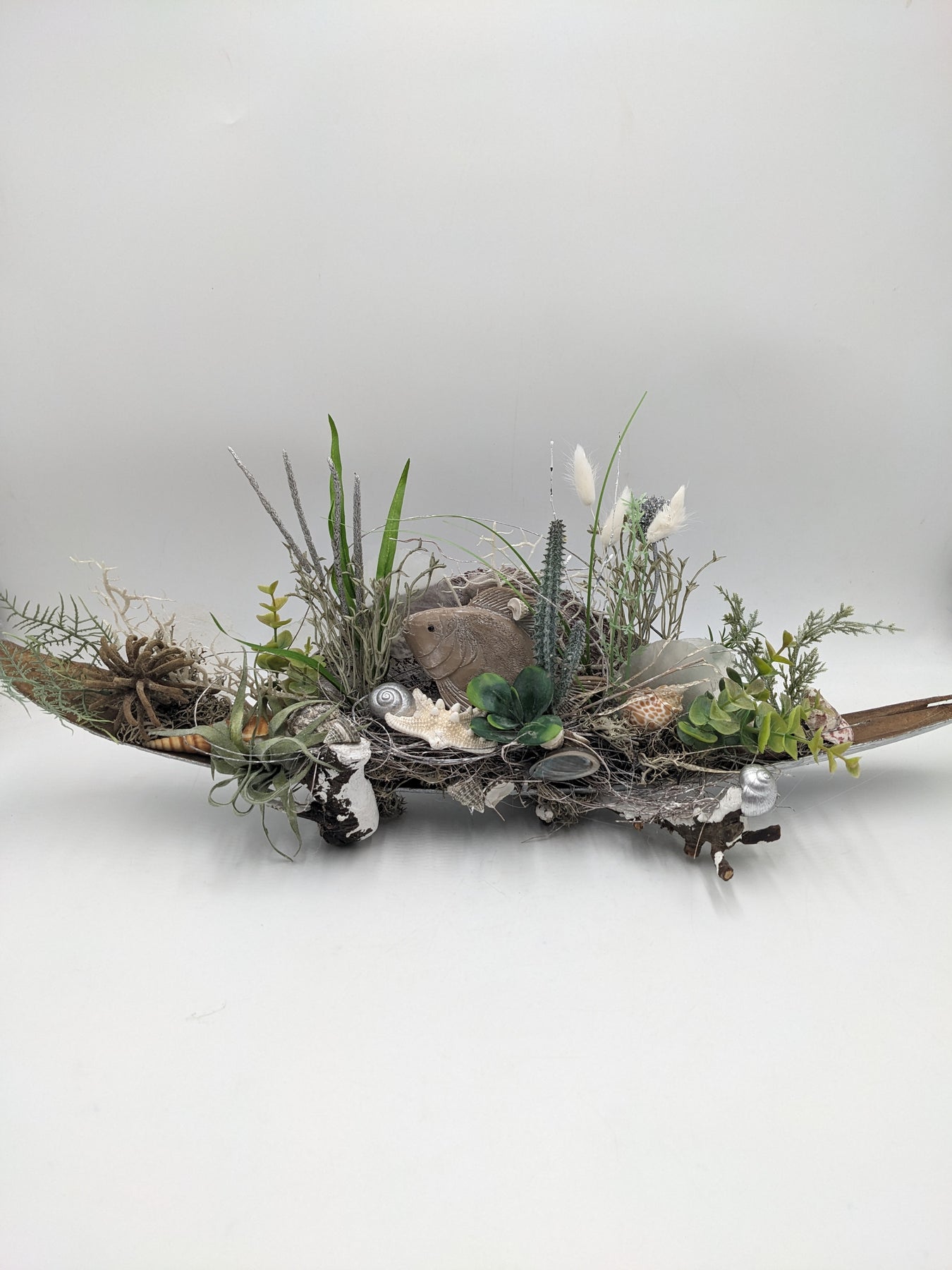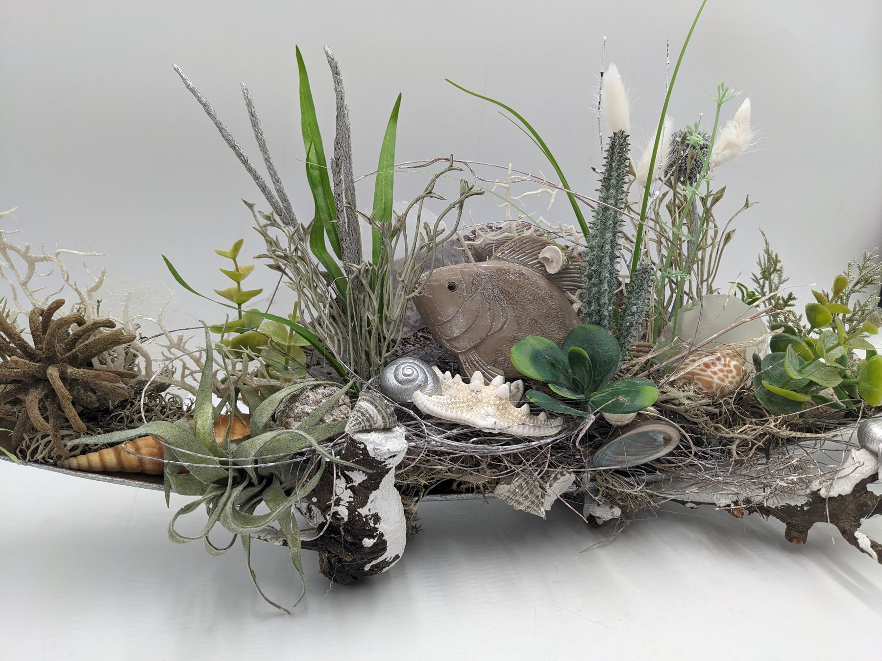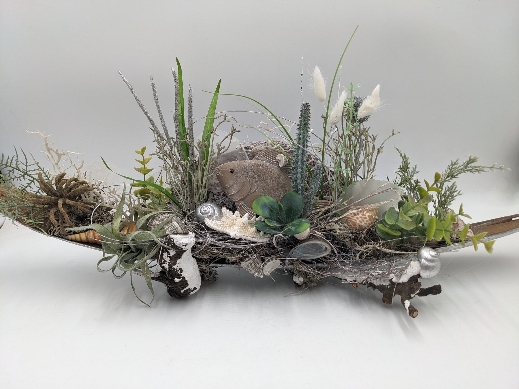 Tischgesteck im Schiffchen, Schnecken, Muscheln, Fisch, Seestern, Eukalypthus, Geäst und Gräser, Farbe: natur, grün, Höhe: ca. 22 cm, Breite: ca. 60 cm, 3239-2025