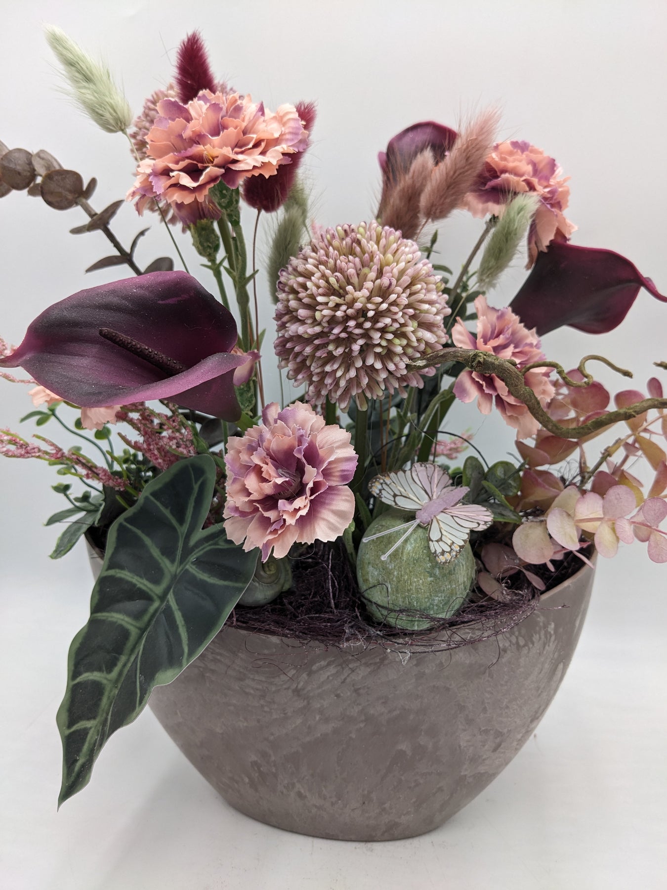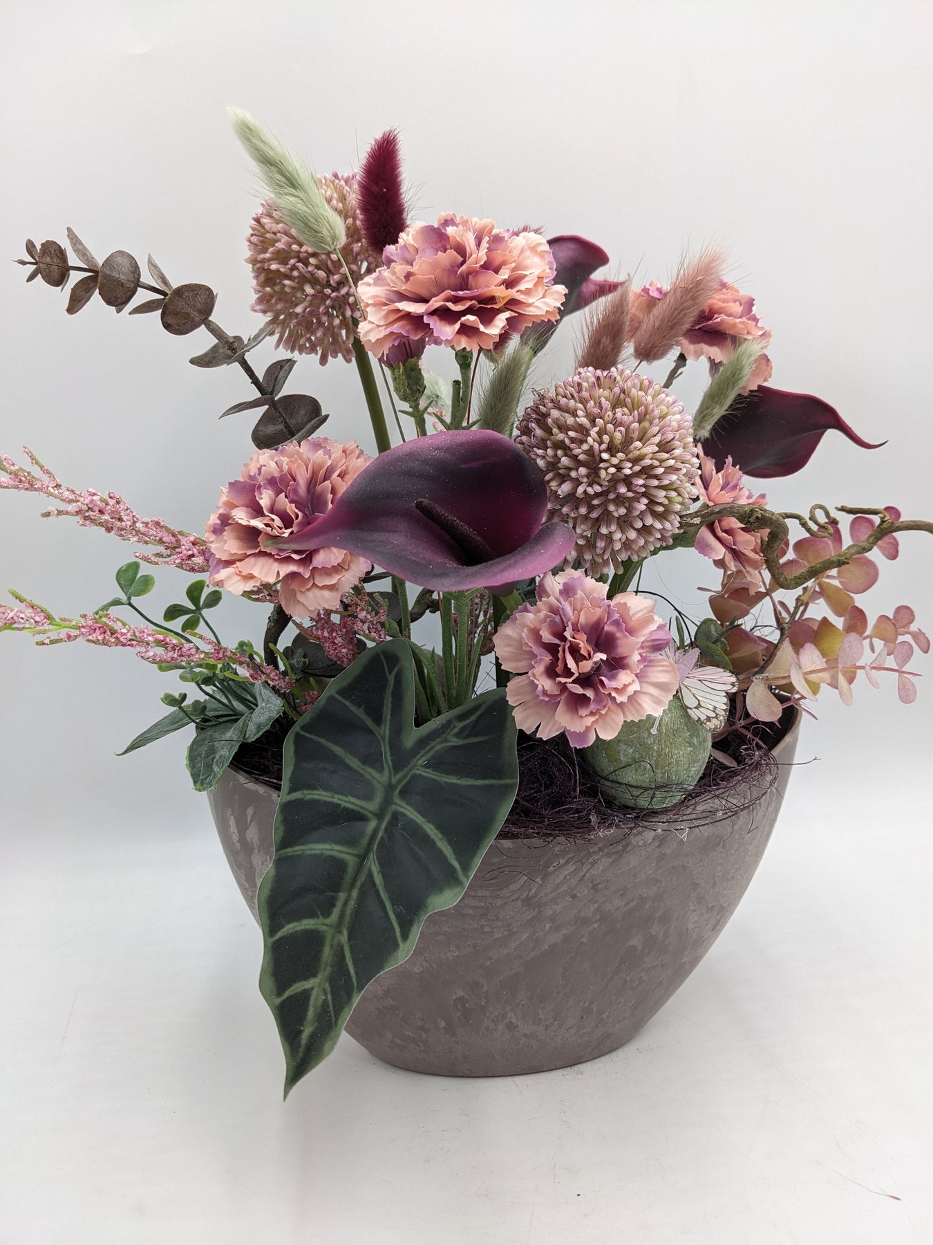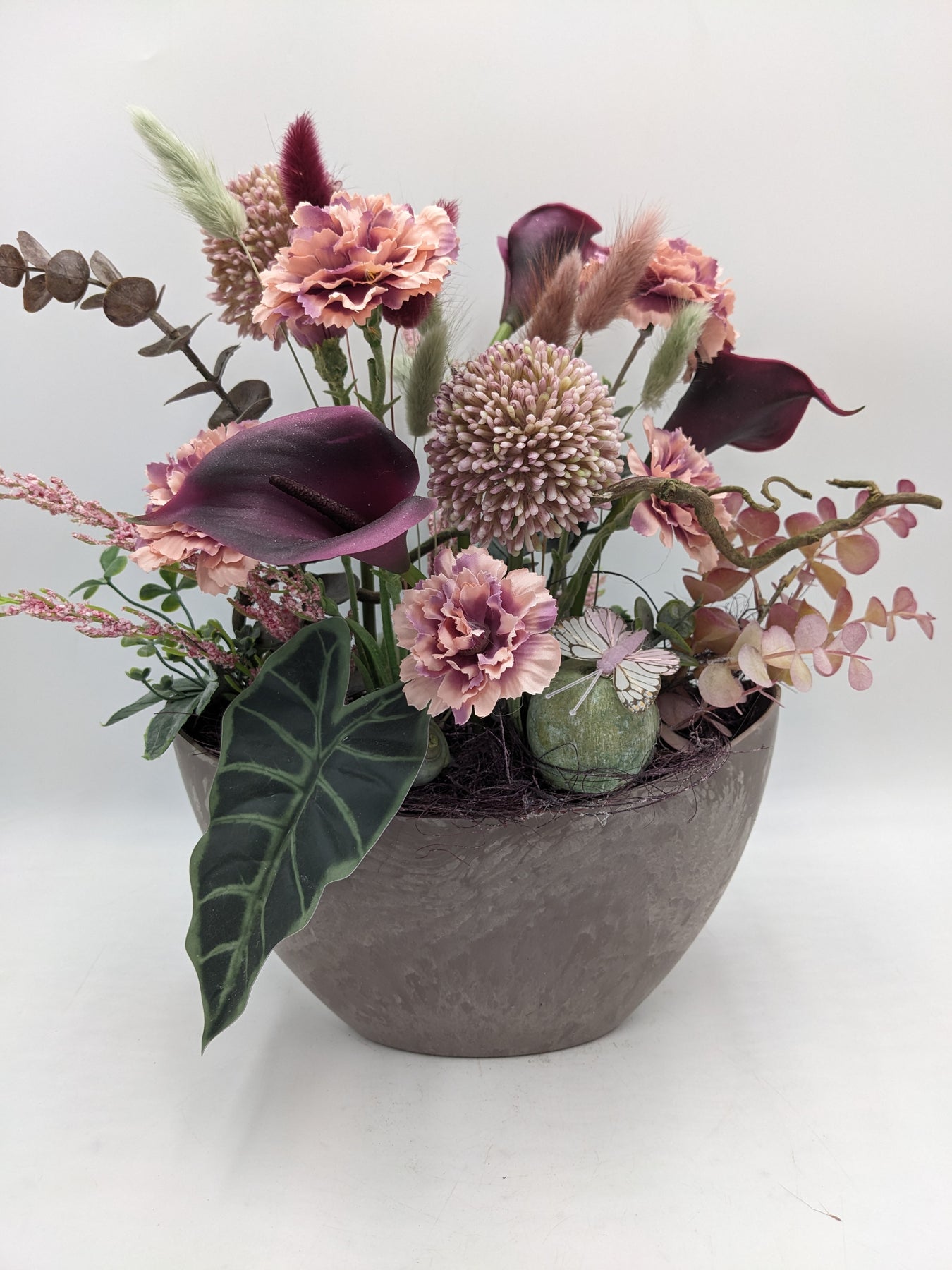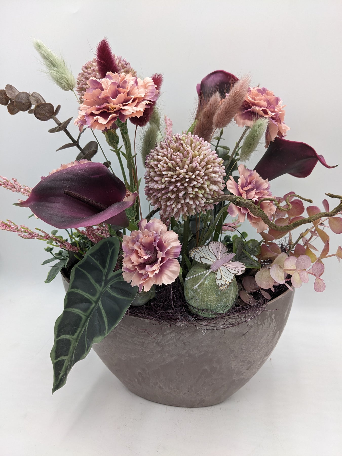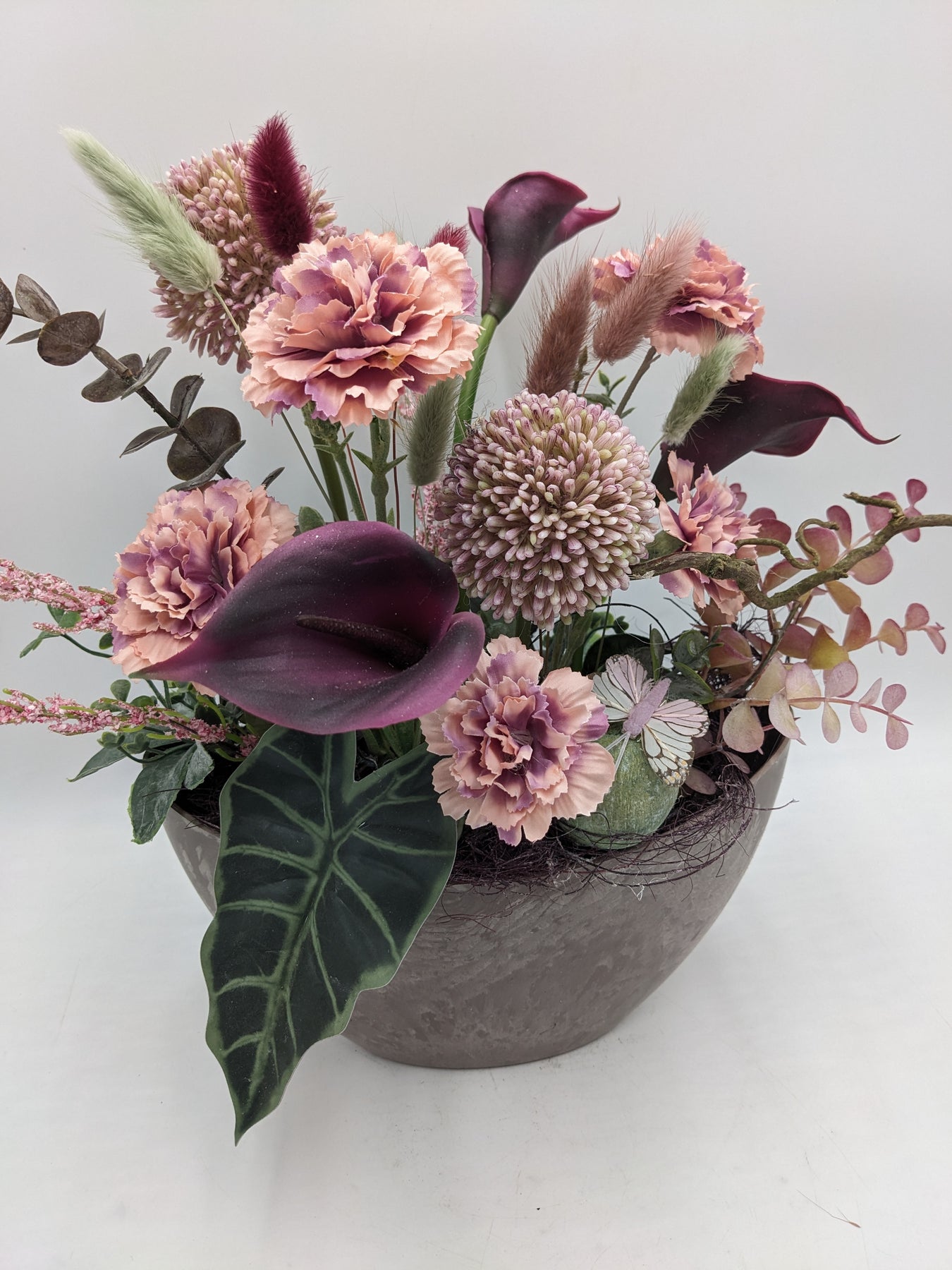 Tischgesteck in Vase, Schmetterling, Callas, Nelken, Eukalypthus und Gräser, Farbe: rosa, lila, Höhe: ca. 34 cm, Breite: ca. 24 cm, 3369-2025