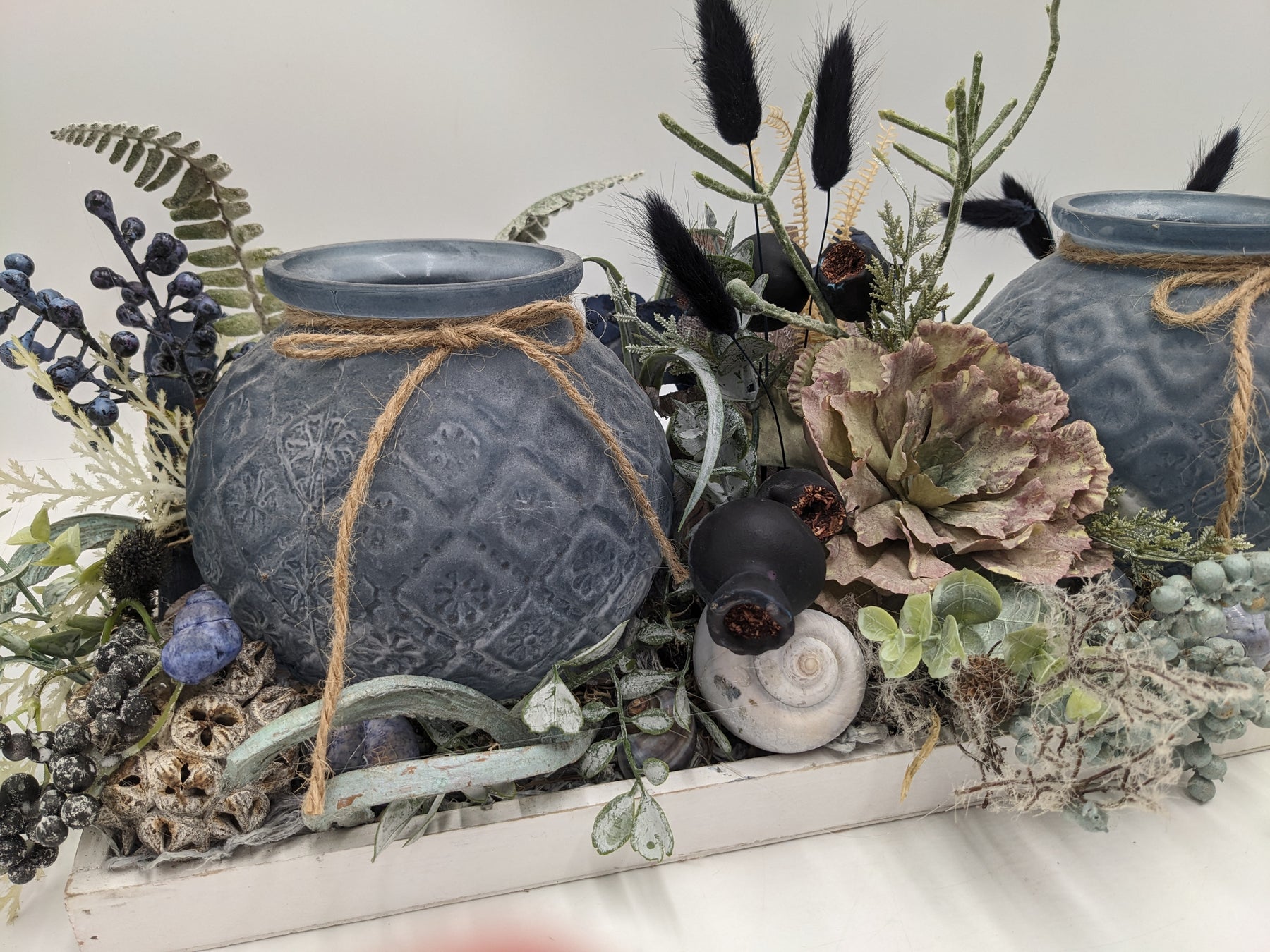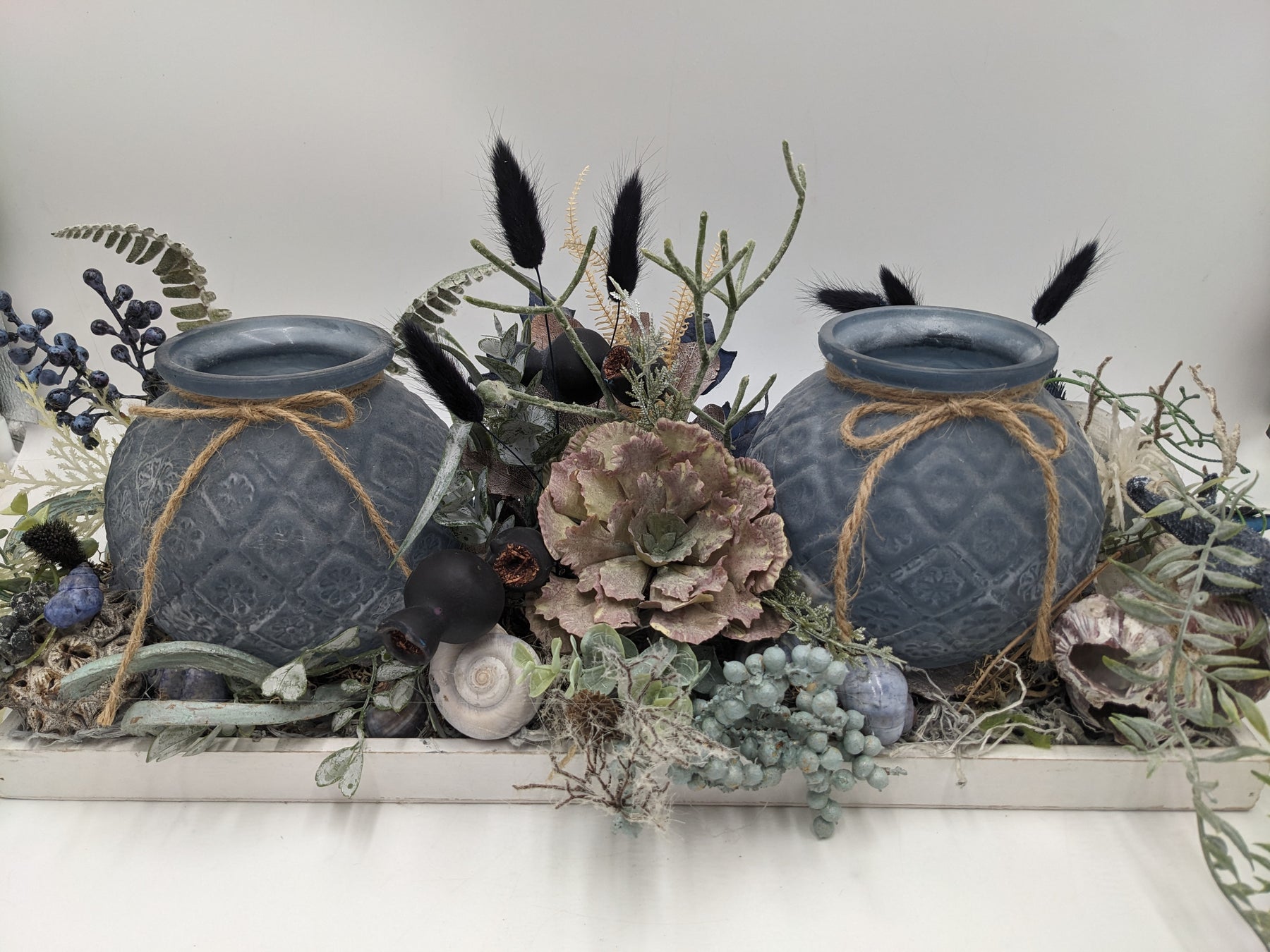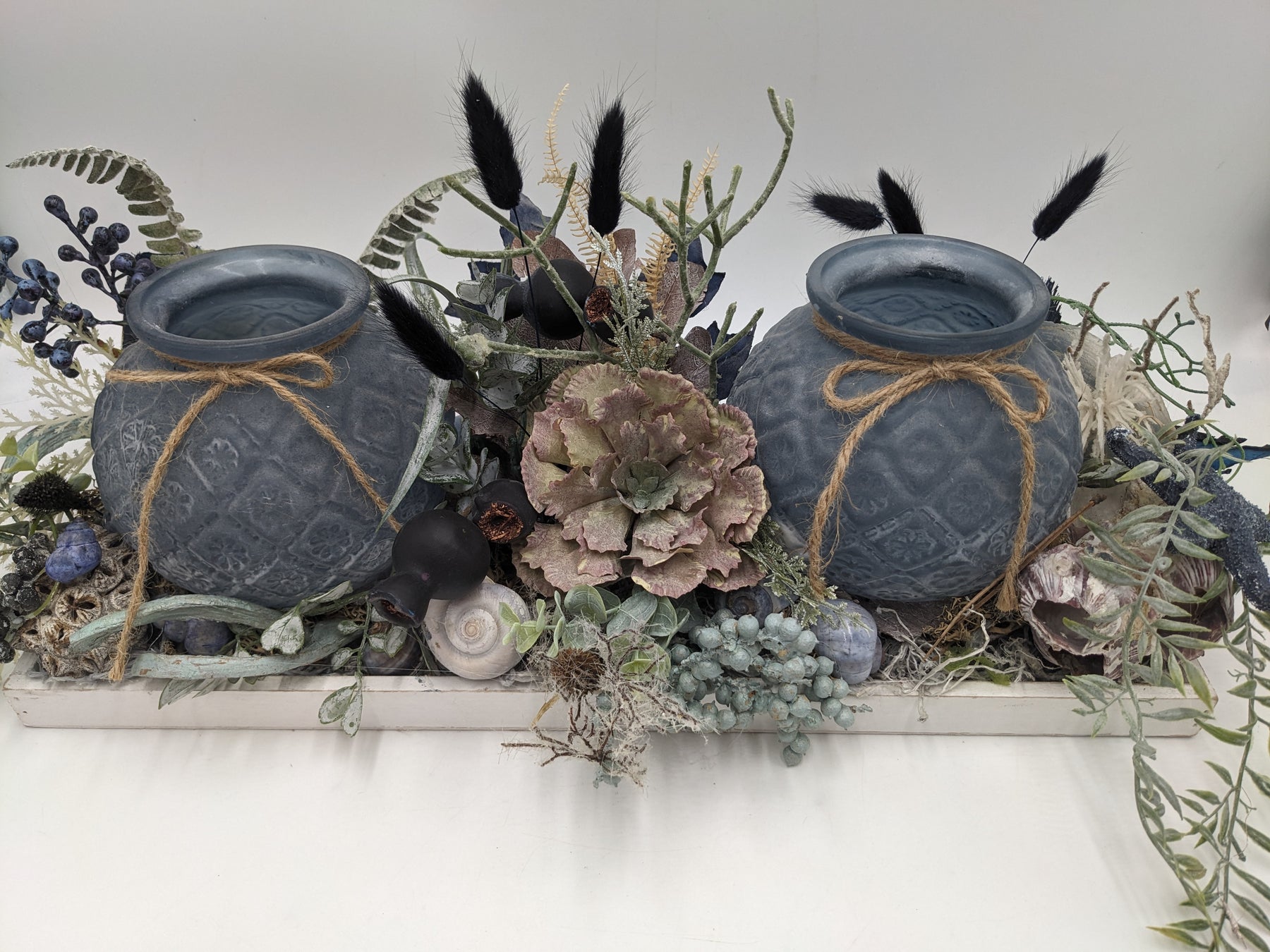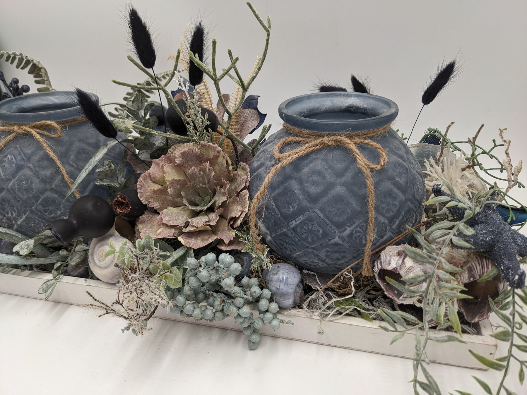 Tischgesteck im Tablett mit Teelichter, Schnecken, Seestern, Beeren und Gräser, Farbe: blau, weiß, Höhe: ca. 23 cm, Breite: ca. 49 cm, Tiefe: ca. 18 cm, 3527-2025