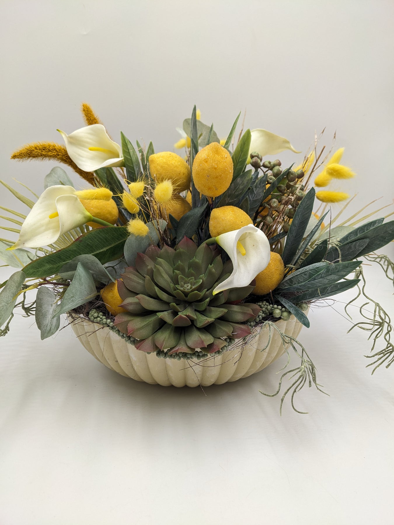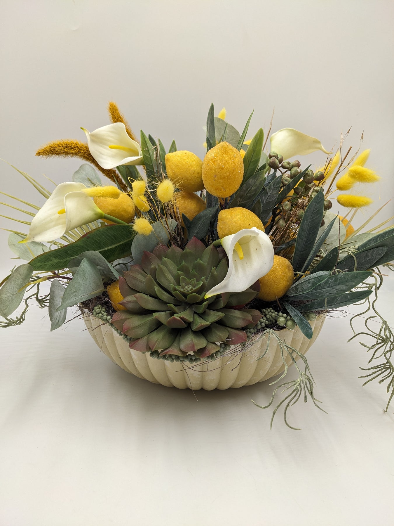 Tischgesteck in Schale, Zitronen, Callas, Sukkulente, Beeren und Gräser, Farbe: gelb, grün, Höhe: ca. 30 cm, Durchmesser: ca. 30 cm, 3382-2025