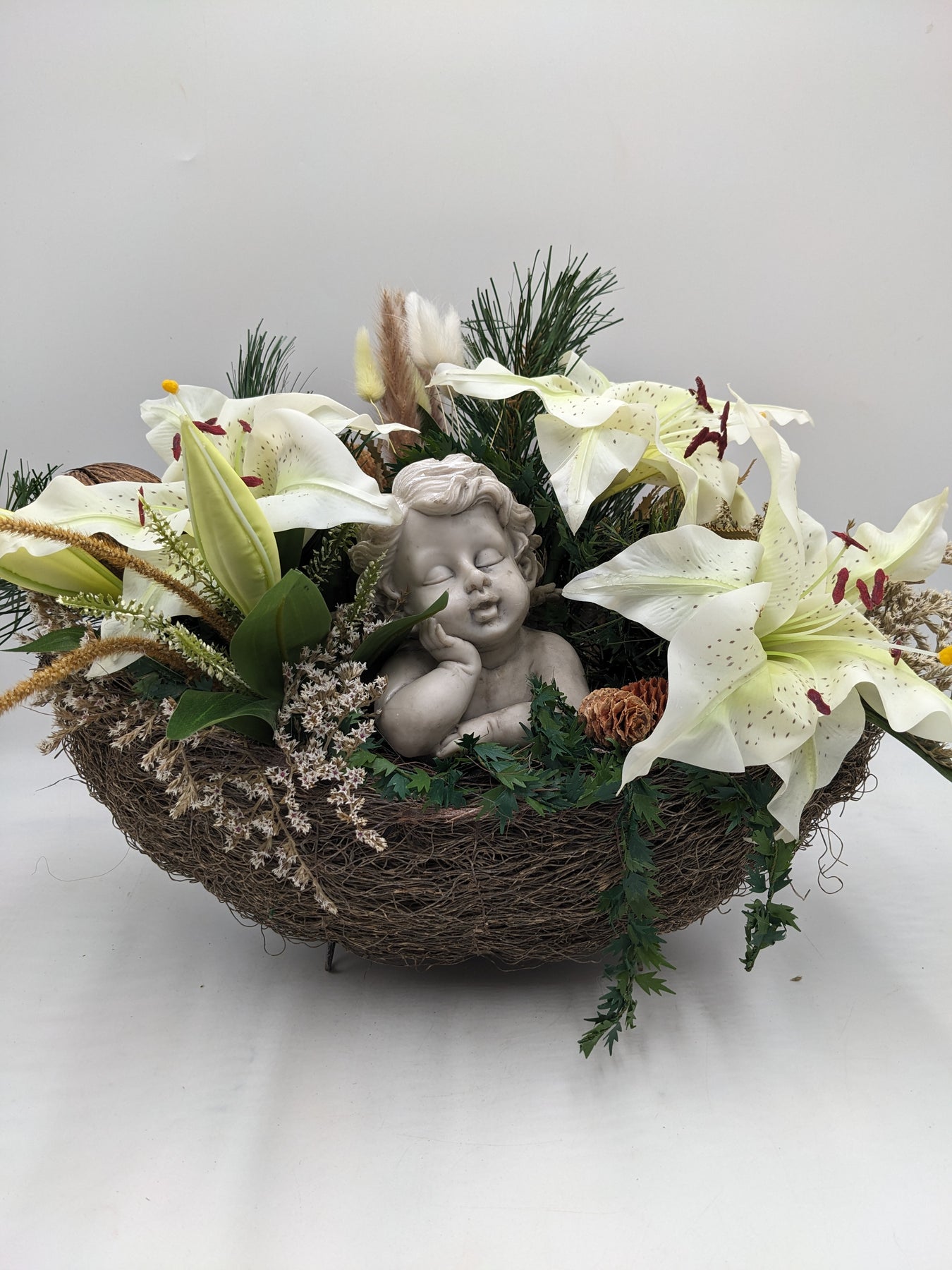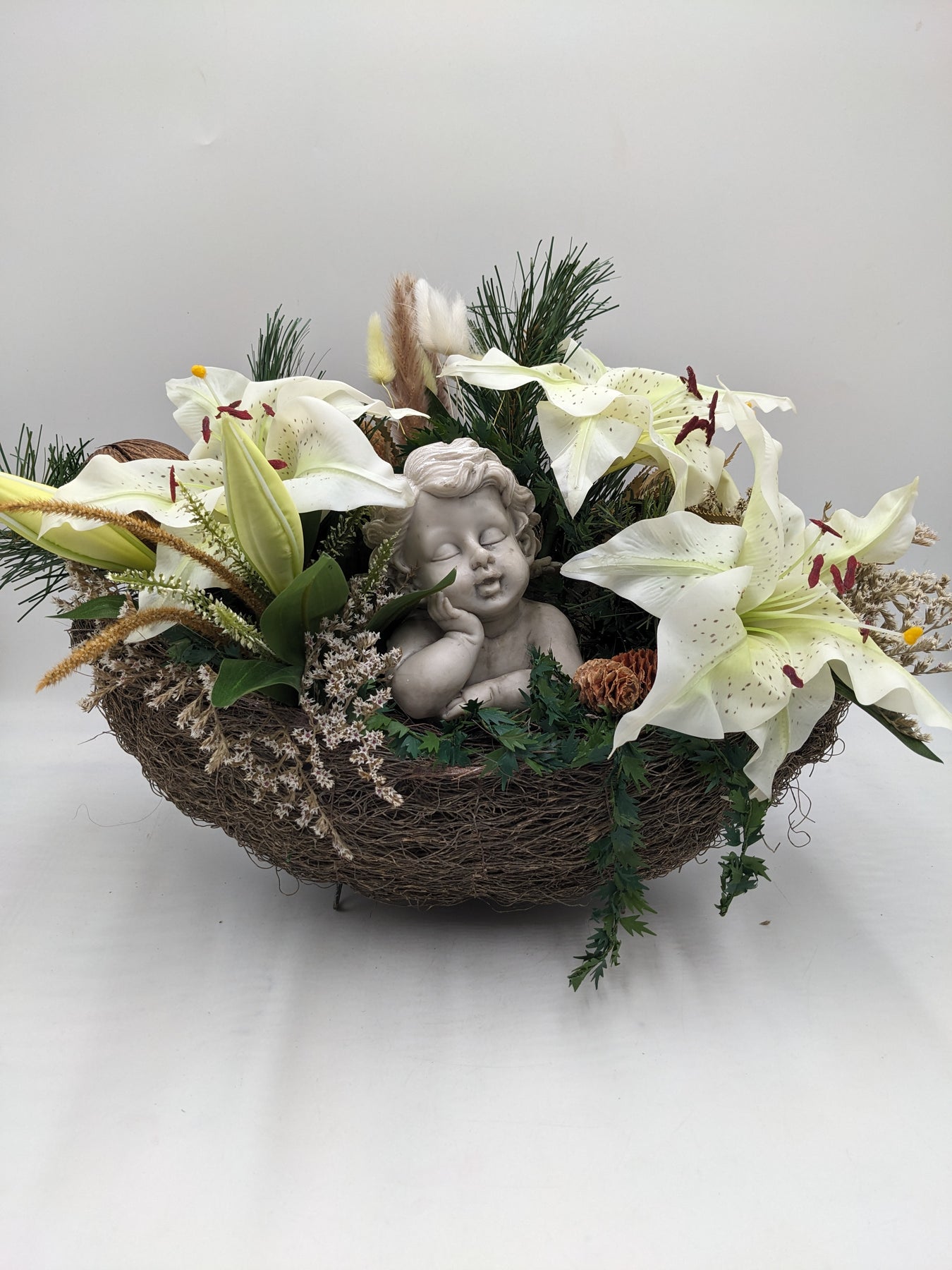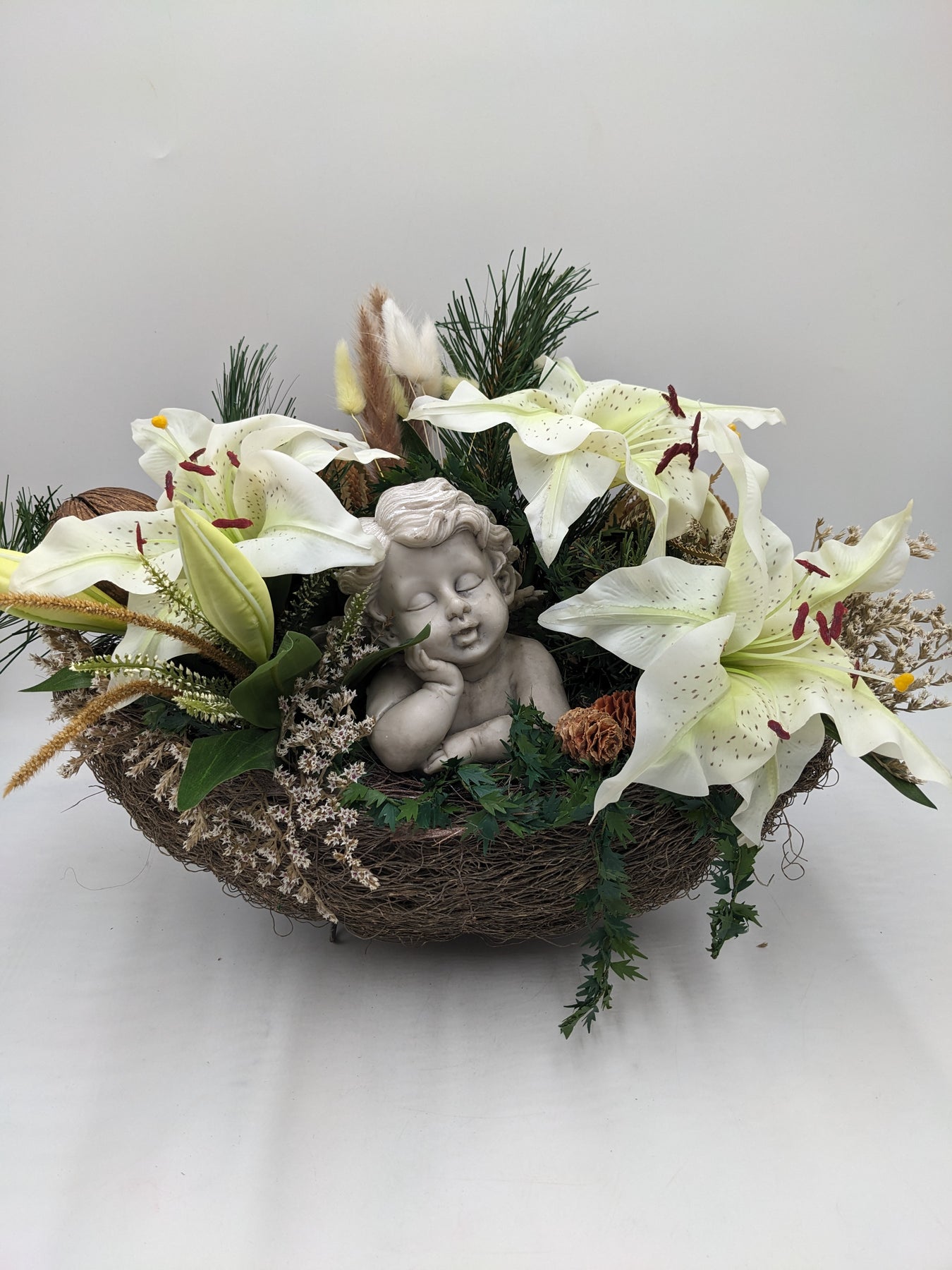 Trauergesteck im Geäst, Engel, Zapfen, Lilien, Heide und Gräser, Farbe: weiß, natur, Höhe: ca. 34 cm, Breite: ca. 45 cm, 3690-2025
