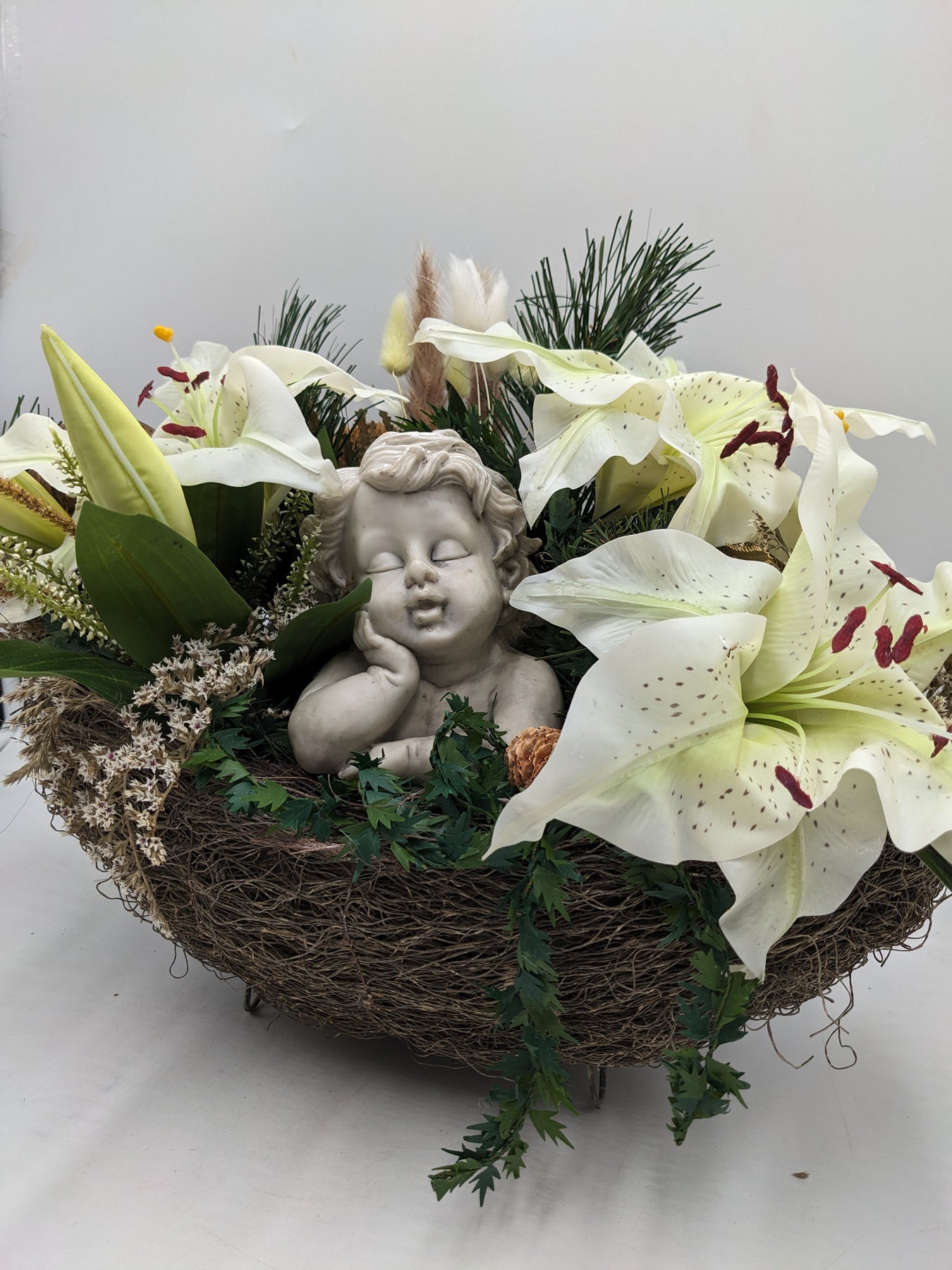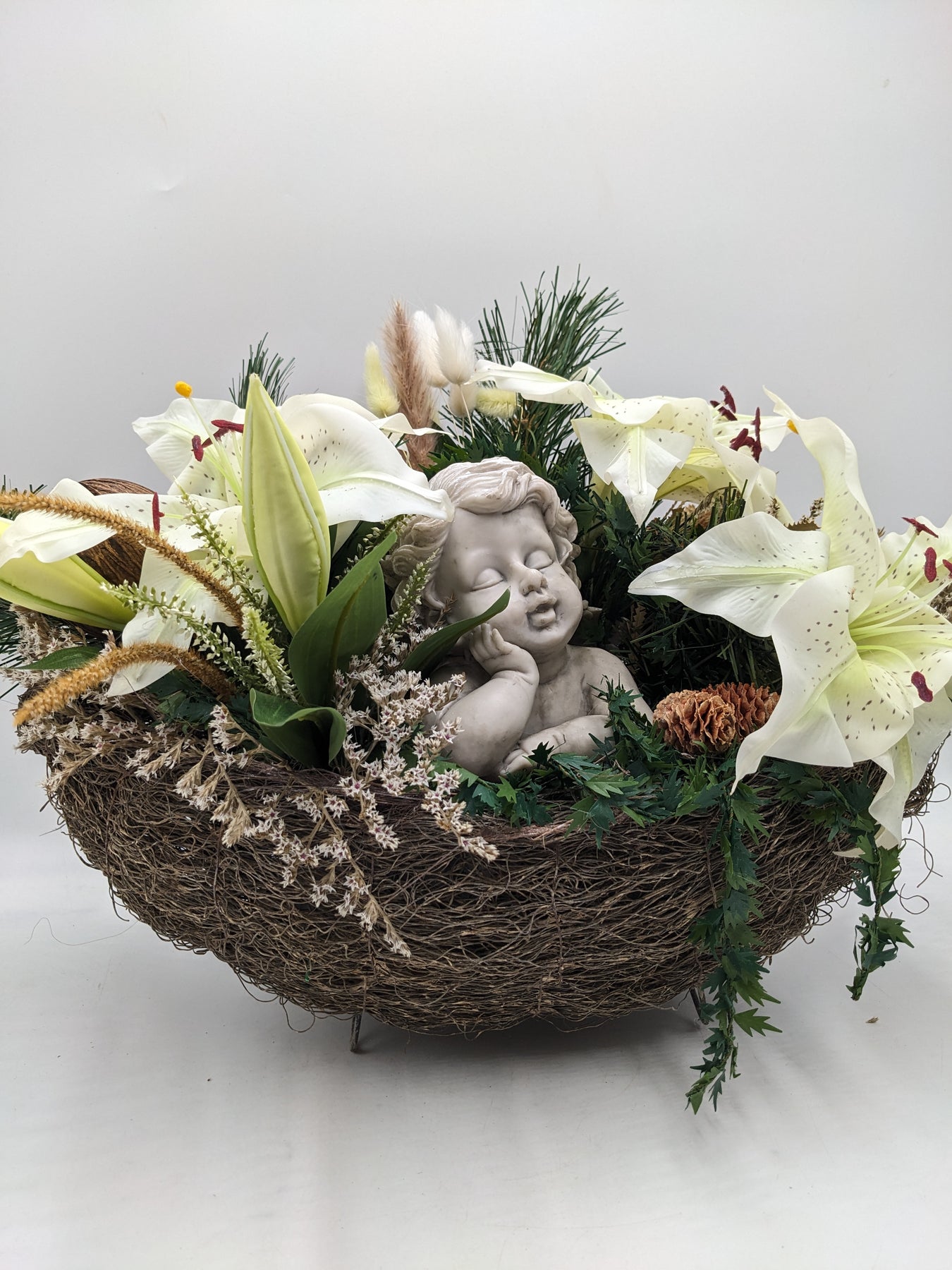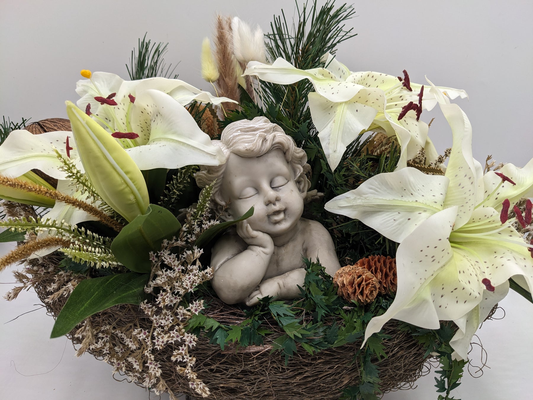 Trauergesteck im Geäst, Engel, Zapfen, Lilien, Heide und Gräser, Farbe: weiß, natur, Höhe: ca. 34 cm, Breite: ca. 45 cm, 3690-2025