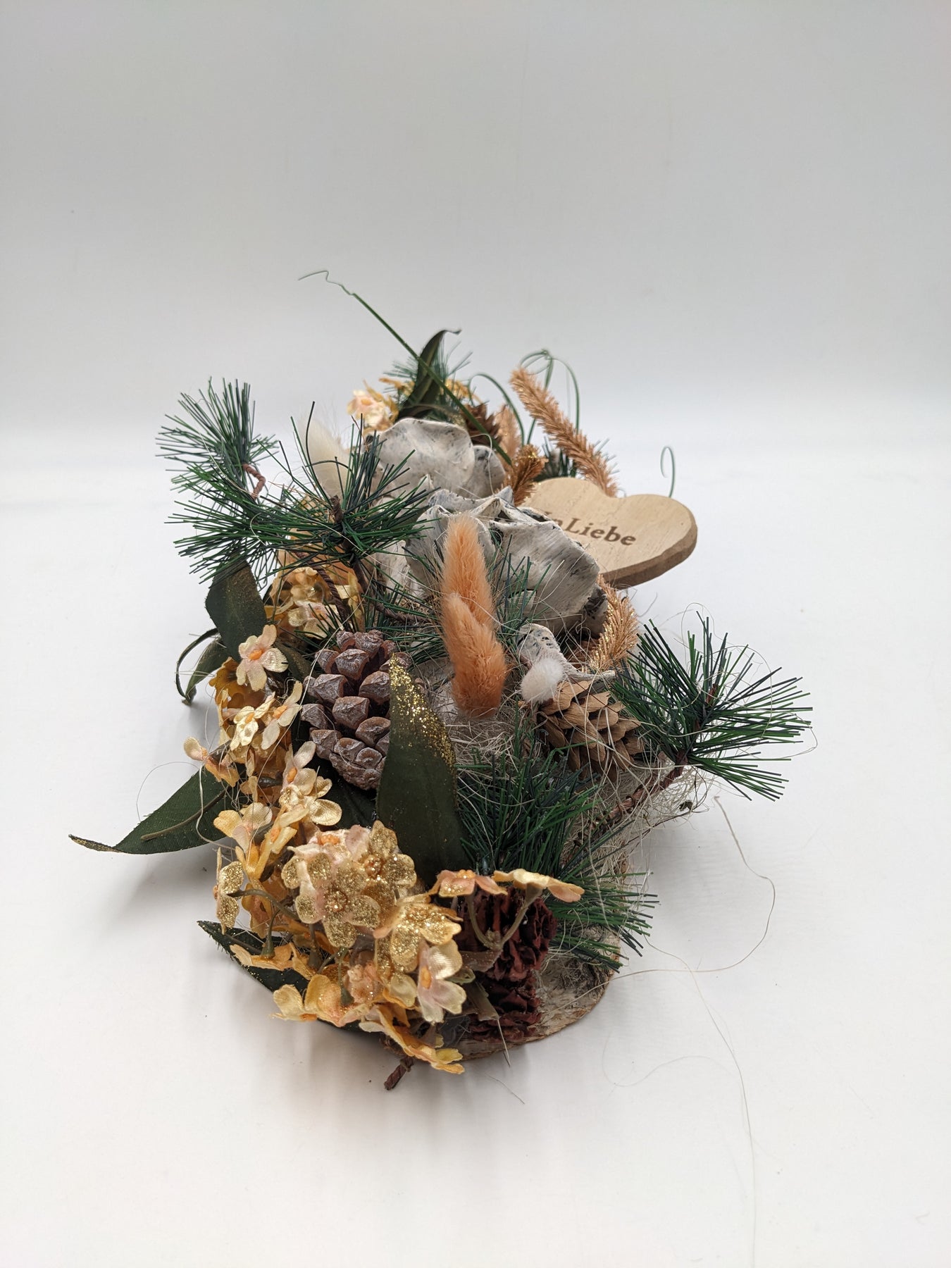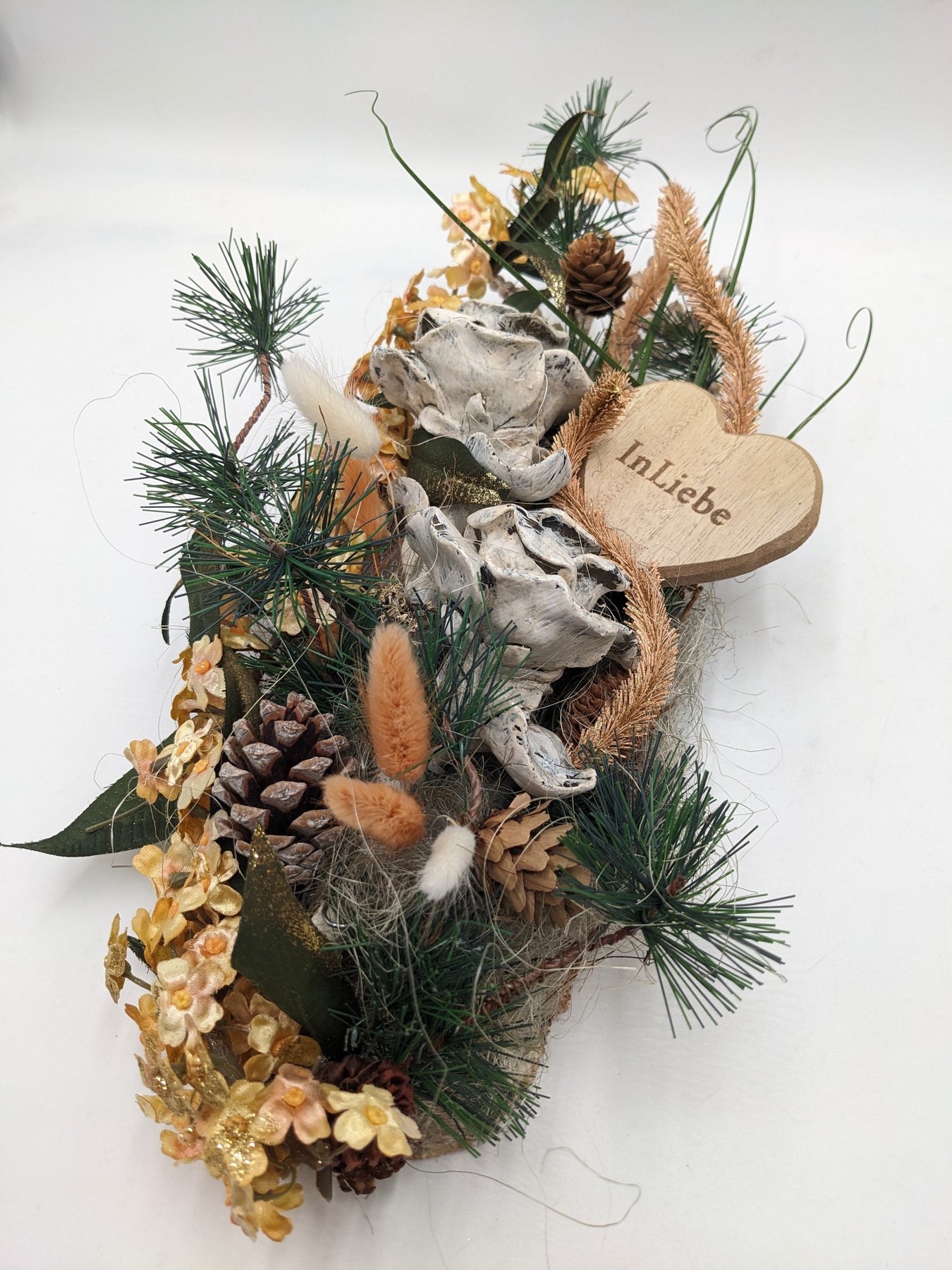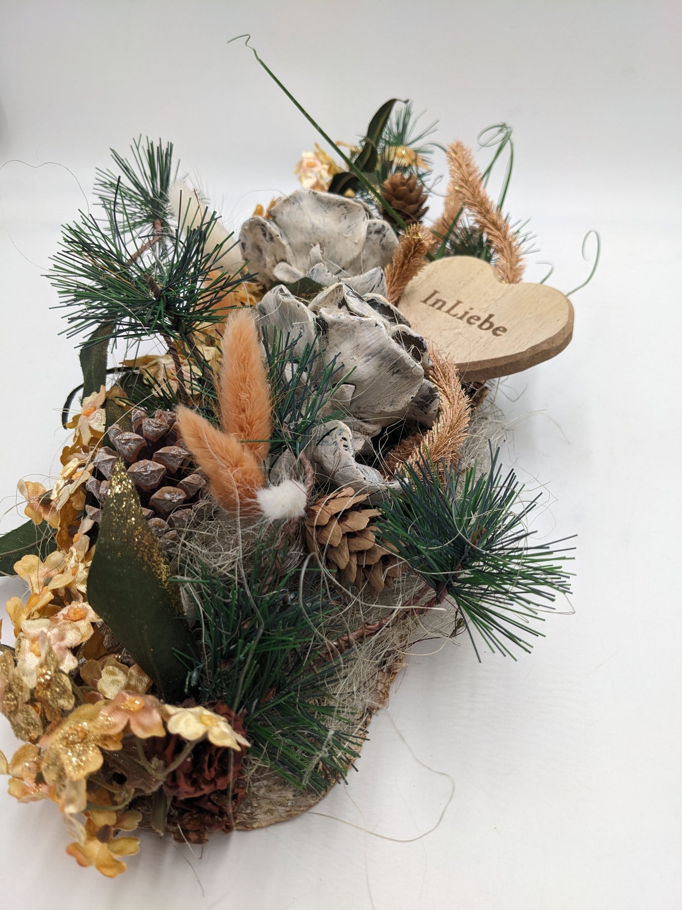 Trauergesteck, Herz, Rose, Zapfen, Gräser und Tanne, Farbe: natur, grün, Höhe: ca. 12 cm, Breite: ca. 15 cm, Tiefe: ca. 30 cm, 3790-2025