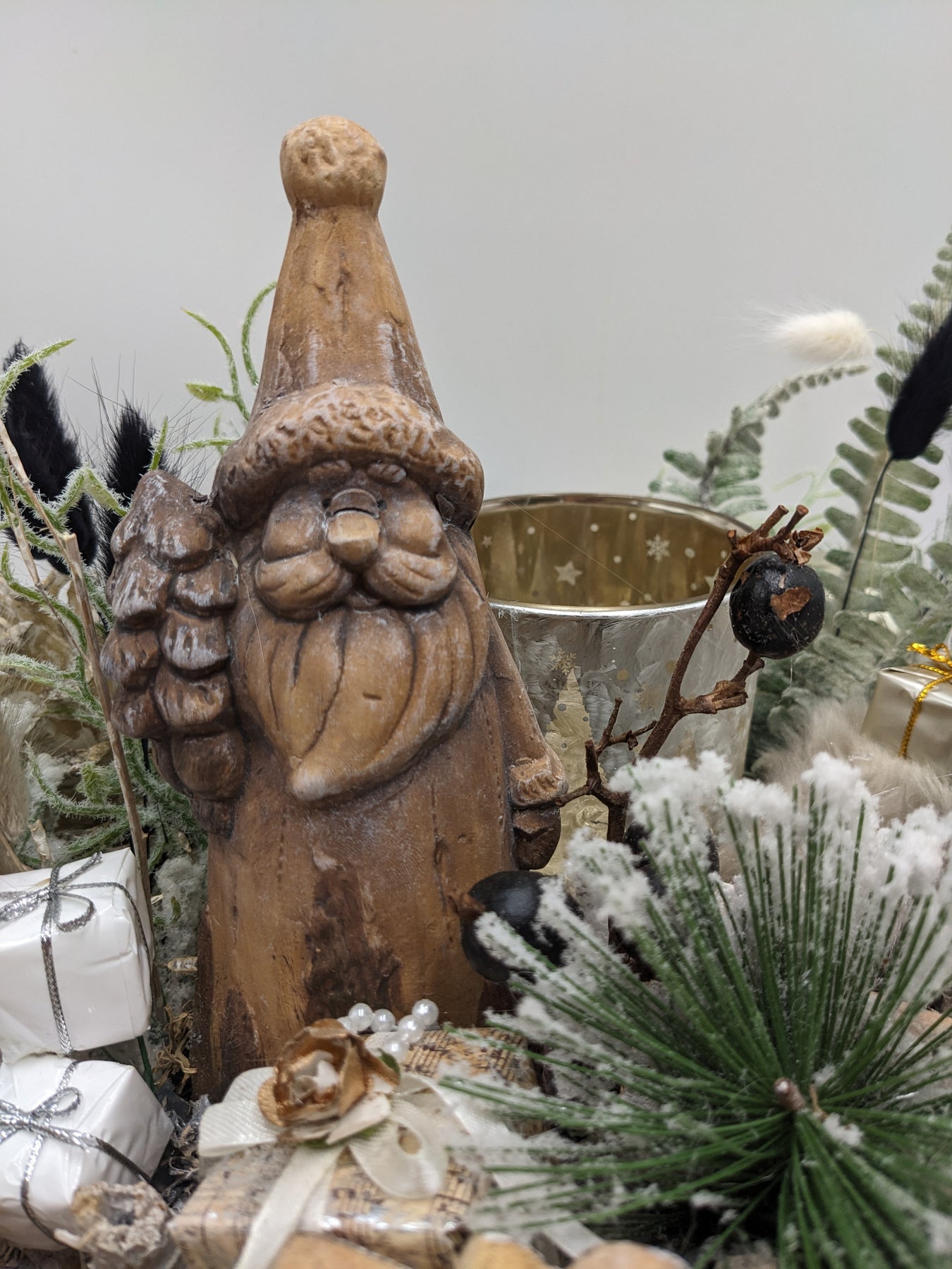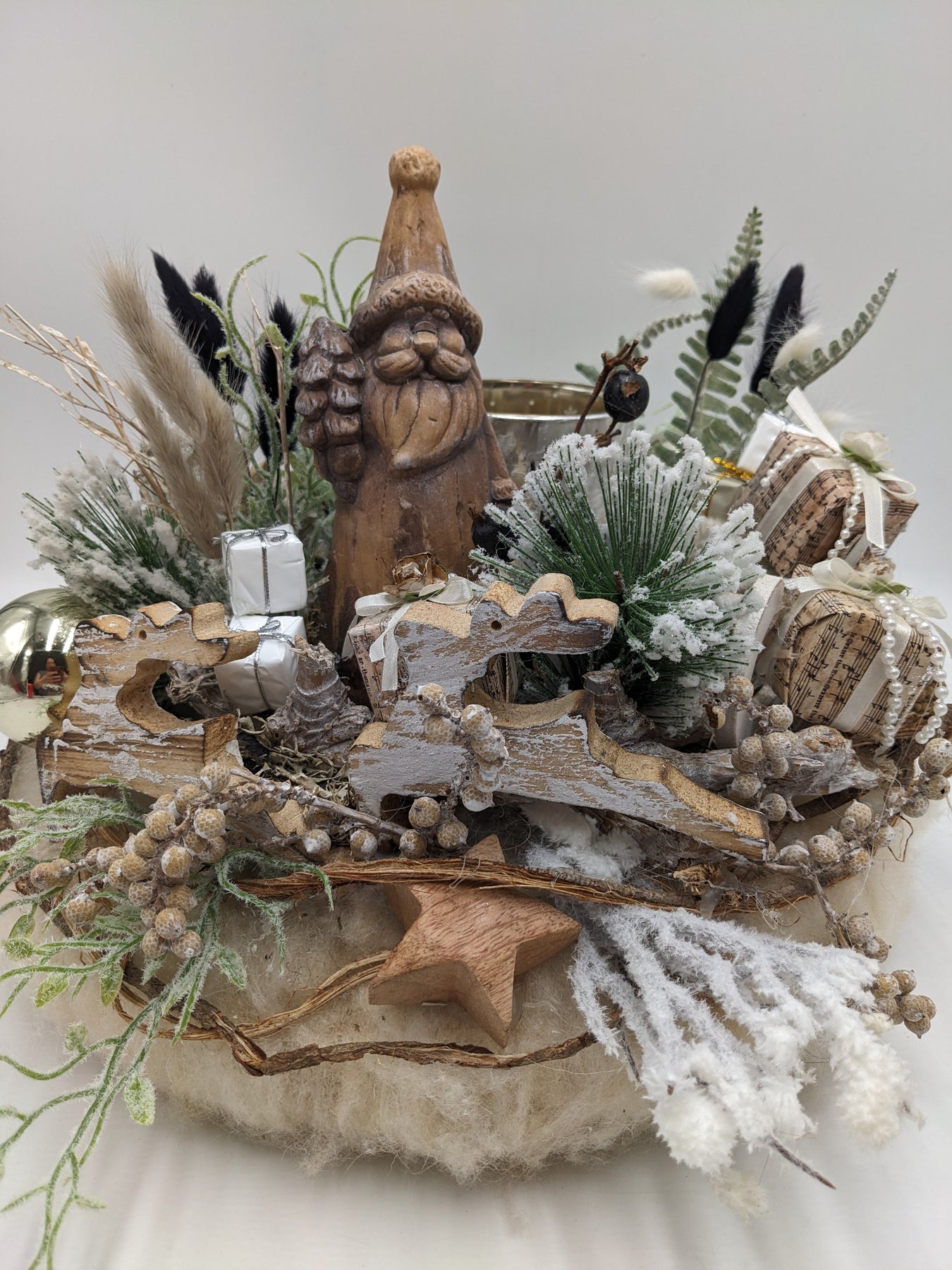 Tischkranz mit Teelicht, Kugeln, Geschenke, Weihnachtsmann, Sterne, Beeren, Gräser und Tanne, Farbe: creme, schwarz, Höhe: ca. 28 cm, Durchmesser: ca. 35 cm, 3473-2025